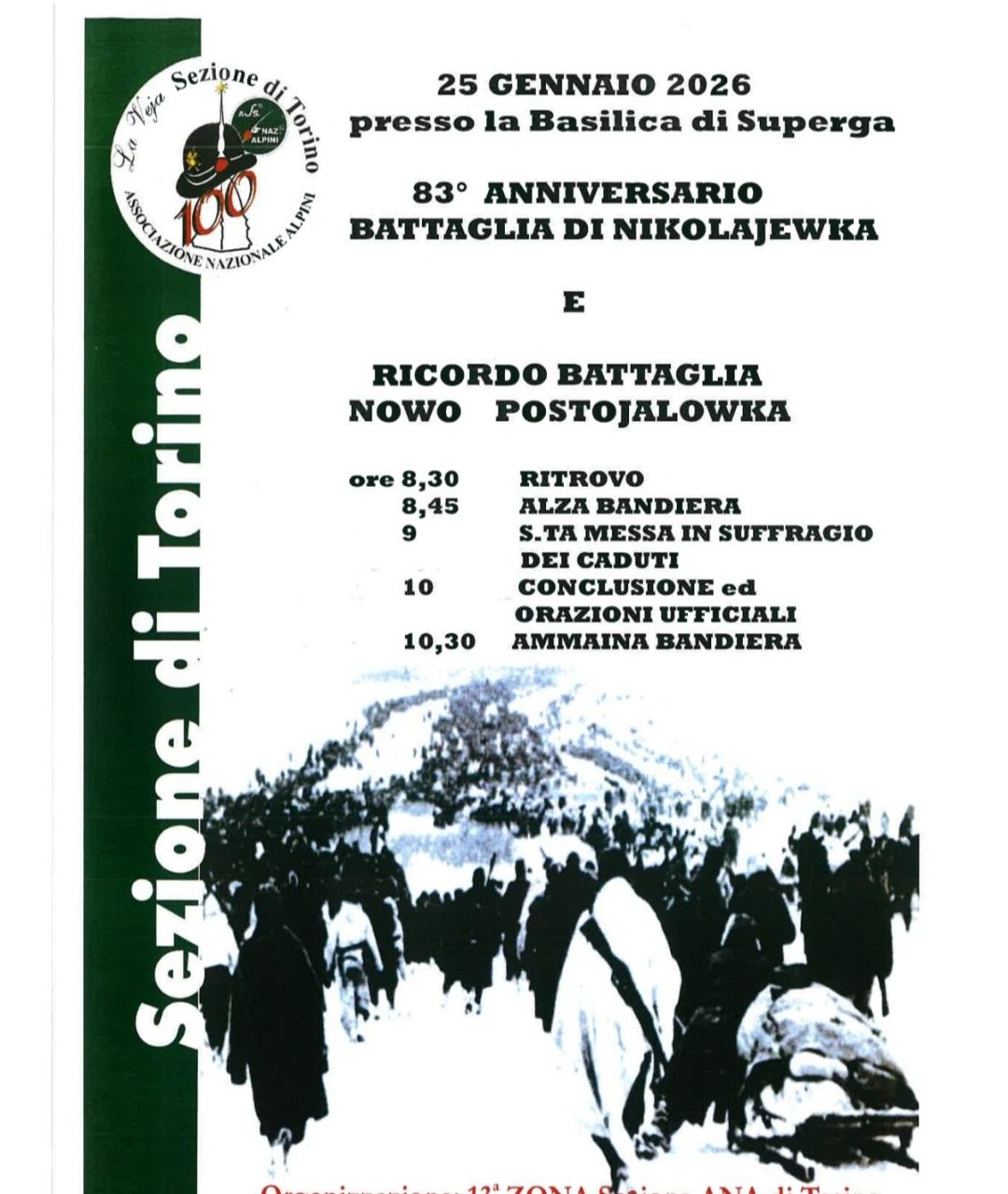 L’evento, organizzato dalla Sezione di Torino “La Veja” dell’Associazione Nazionale Alpini, celebra l’83° anniversario della Battaglia di Nikolajewka e il ricordo della Battaglia di Nowo Postojalowka, due episodi simbolo della drammatica ritirata dell’inverno 1943. La commemorazione, accompagnata dalla Fanfara Montenero di Torino, riunirà Alpini, familiari, cittadini e appassionati di storia in uno dei luoghi più carichi di significato del capoluogo piemontese.