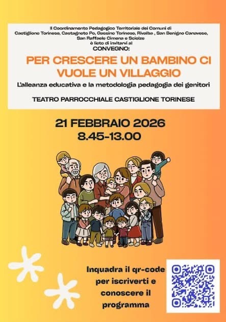Un’alleanza educativa che parte dai territori, dalle famiglie e da chi ogni giorno lavora accanto ai bambini. È questo il filo conduttore del convegno “Per crescere un bambino ci vuole un villaggio”, in programma sabato 21 febbraio al teatro parrocchiale di Castiglione Torinese, dalle 8:45 alle 13. Un appuntamento che riunisce amministratori, educatori, insegnanti e genitori attorno a un tema sempre più centrale: il ruolo della comunità nella crescita dei più piccoli.