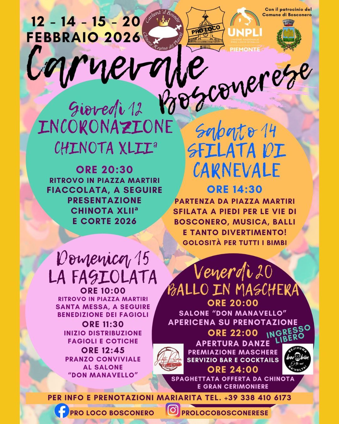 Tutti gli appuntamenti del Carnevale sono organizzati dalla Pro Loco di Bosconero. Per informazioni e prenotazioni è possibile contattare il numero 338 4106173.