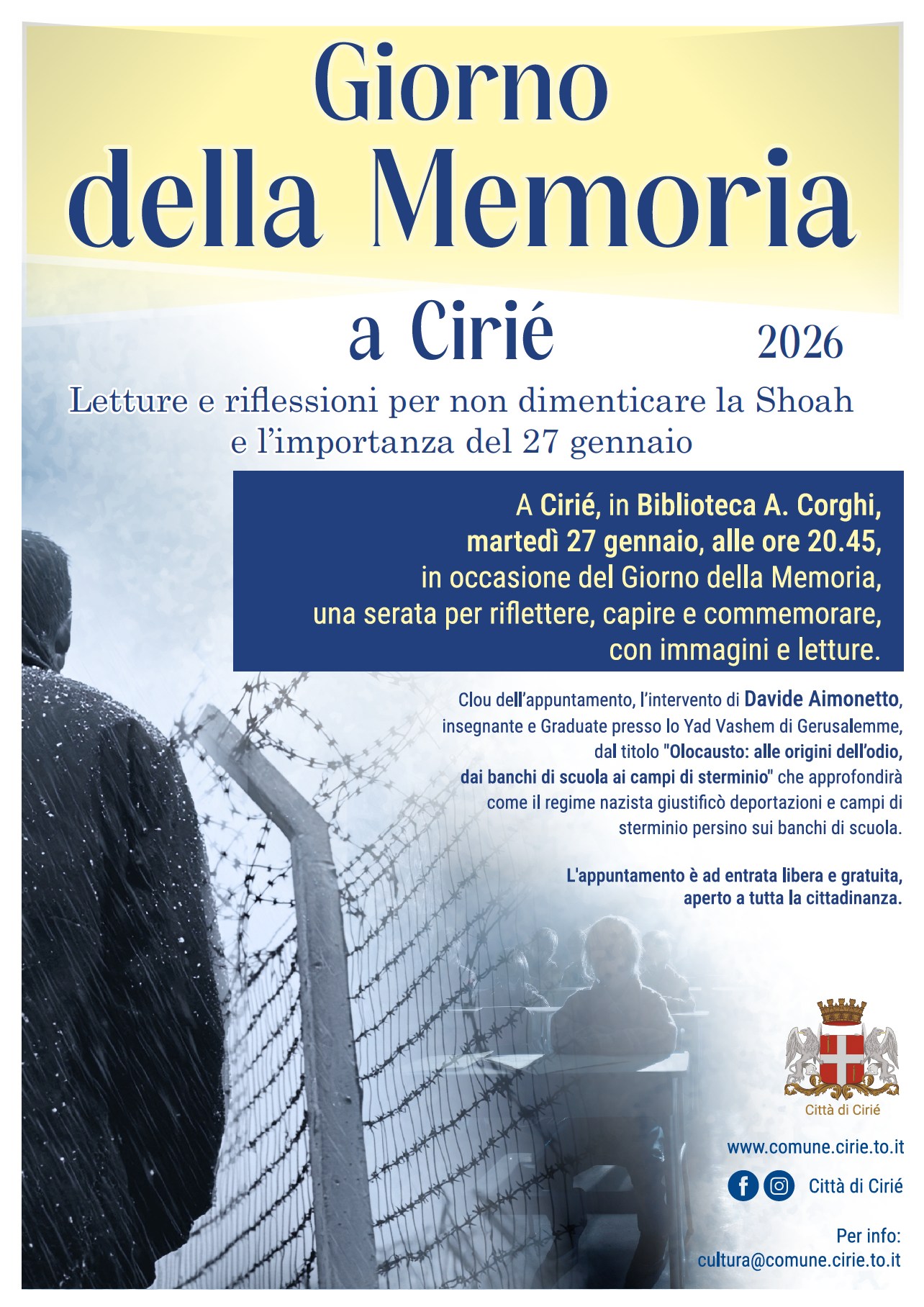 Il Giorno della Memoria a Cirié non si limita a una ricorrenza formale, ma si trasforma in un momento pubblico di riflessione collettiva, pensato per andare oltre il rito e interrogare coscienze e responsabilità. Questa sera, martedì 27 gennaio, la Biblioteca Civica A. Corghi ospita una serata promossa dalla Città di Cirié dedicata al ricordo delle vittime della Shoah e alla comprensione delle persecuzioni generate dalle leggi razziali, con un programma che intreccia letture, immagini e approfondimenti storici.