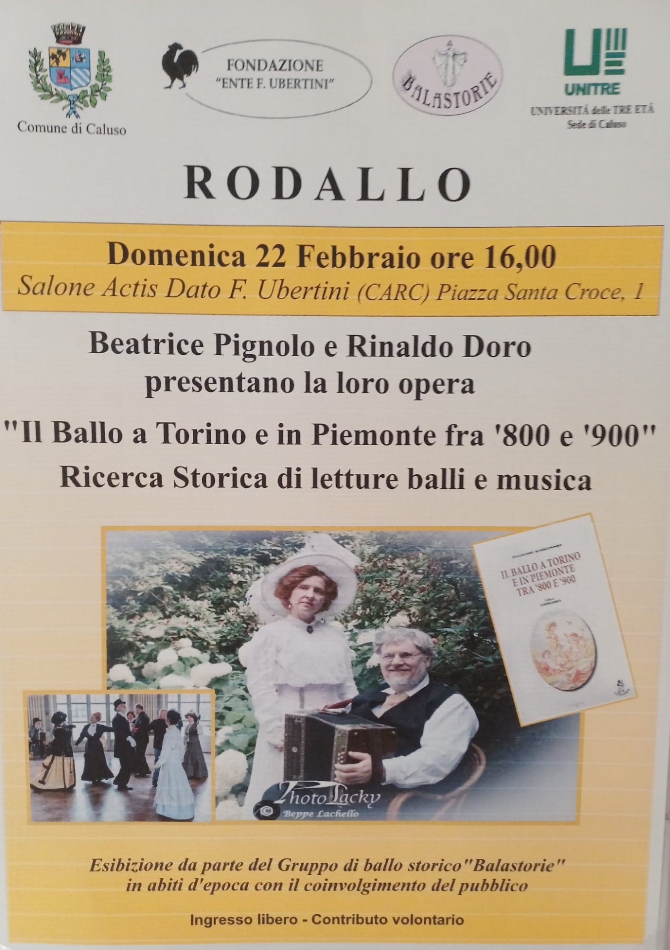 Un viaggio nel tempo attraverso la musica, i passi di danza e le consuetudini sociali che hanno animato saloni, feste e ritrovi tra Torino e il Piemonte fra la fine dell’Ottocento e i primi decenni del Novecento. È questo il filo conduttore dell’iniziativa in programma domenica 22 febbraio alle ore 16, a Rodallo, presso il Salone Actis Dato F. Ubertini (CARC) di piazza Santa Croce 1, promossa dal Comune di Caluso, dalla Fondazione Ente F. Ubertini, dal gruppo Balastorie e dall’Unitre – Università delle Tre Età di Caluso.