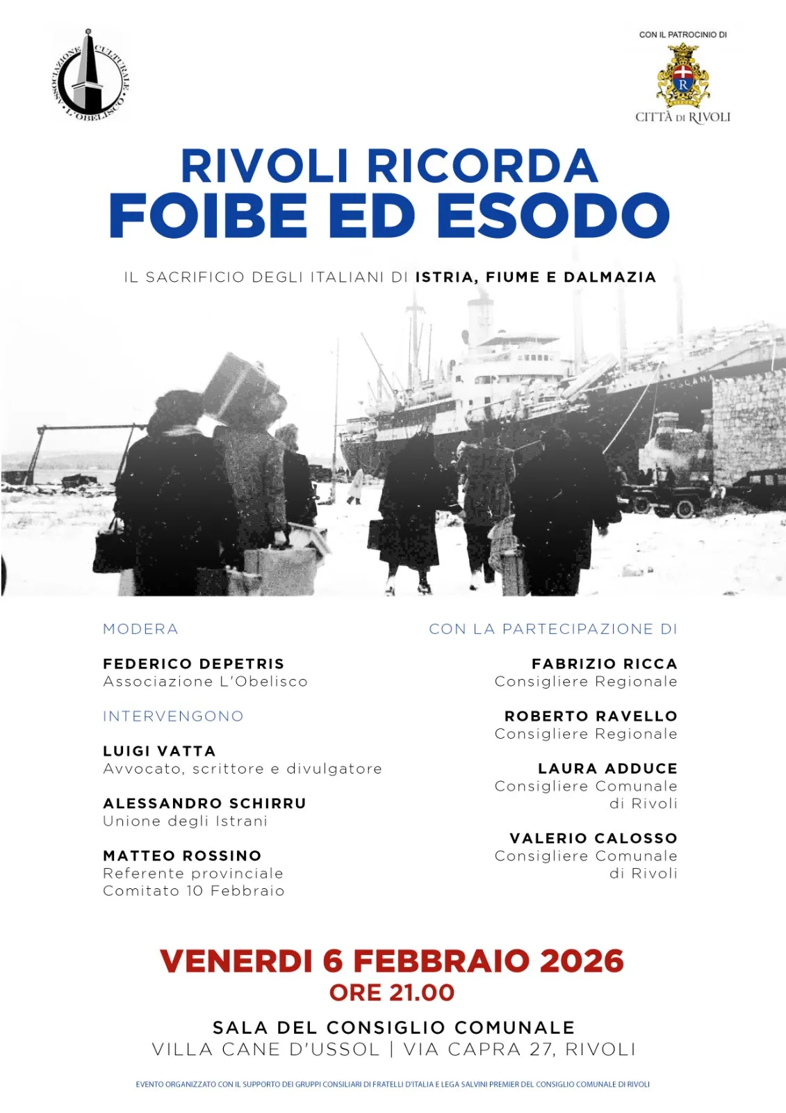 Un momento di confronto pubblico dedicato a foibe ed esodo giuliano-dalmata, per riportare al centro del dibattito una pagina complessa e ancora divisiva della storia del Novecento. È l’obiettivo del convegno in programma giovedì 6 febbraio a Rivoli, organizzato dall’associazione culturale rivolese L’Obelisco e patrocinato dal Comune di Rivoli.