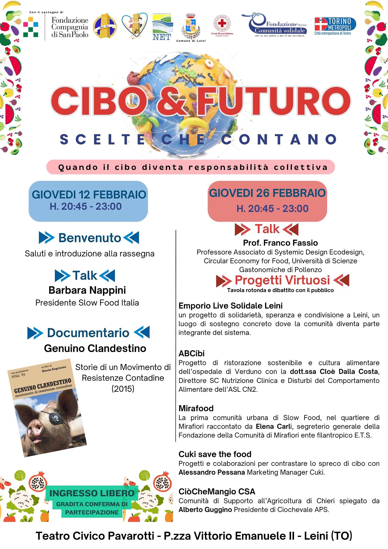 Il secondo appuntamento, il 26 febbraio, sarà invece dedicato al confronto: una tavola rotonda con esperti universitari per analizzare il presente e il futuro dei sistemi alimentari, accompagnata dalla presentazione dei “Progetti Virtuosi”, esperienze concrete che dimostrano come un altro modello sia possibile. Tra queste, l’Emporio Solidale di Leini, simbolo di solidarietà locale, e iniziative attive sul fronte della riduzione dello spreco alimentare.