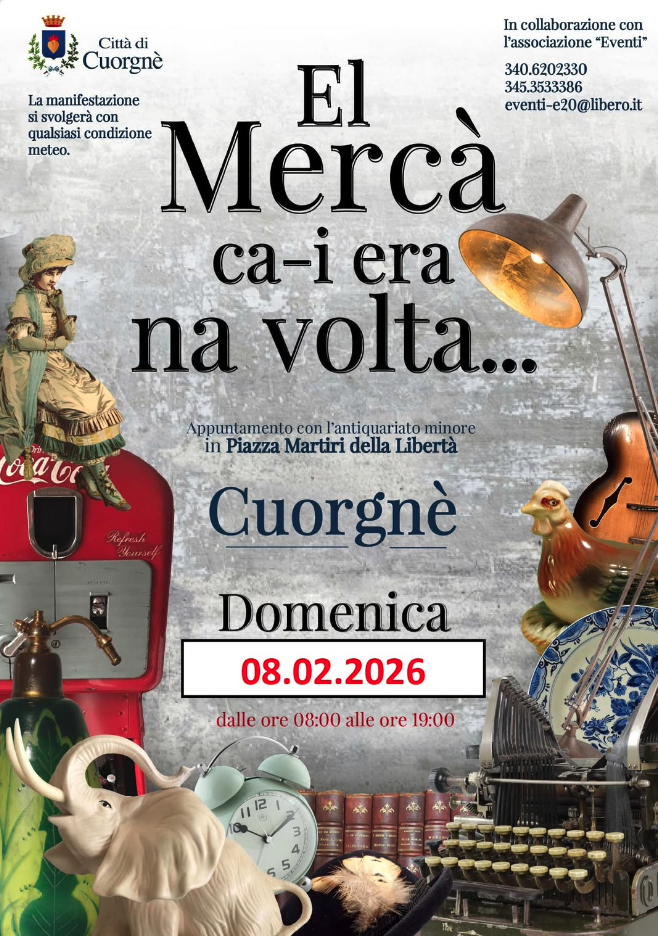 A Cuorgnè torna l’appuntamento con l’antiquariato minore e il fascino degli oggetti che raccontano storie. Domenica 8 febbraio 2026, Piazza Martiri della Libertà ospiterà una nuova edizione di “El Mercà ca-i era na volta…”, manifestazione dedicata al riuso, al collezionismo e alla memoria materiale del passato. L’iniziativa si svolgerà con qualsiasi condizione meteo, dalle ore 8 alle ore 19, trasformando il centro cittadino in un percorso tra pezzi unici, curiosità e oggetti d’epoca.