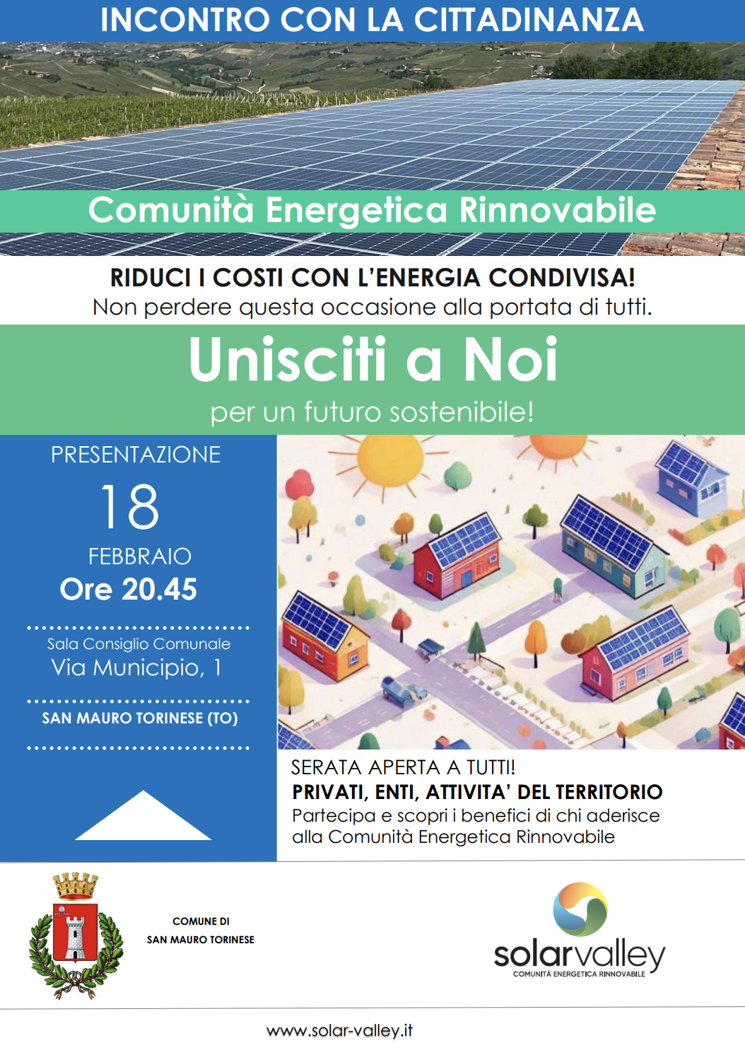 San Mauro Torinese apre le porte alla Comunità Energetica Rinnovabile. Martedì 18 febbraio, alle 20:45, la Sala del Consiglio comunale ospiterà un incontro pubblico dedicato alla CER Solar Valley, un momento di approfondimento rivolto a cittadini, enti e attività del territorio per capire come funziona l’energia condivisa e quali opportunità concrete offre.