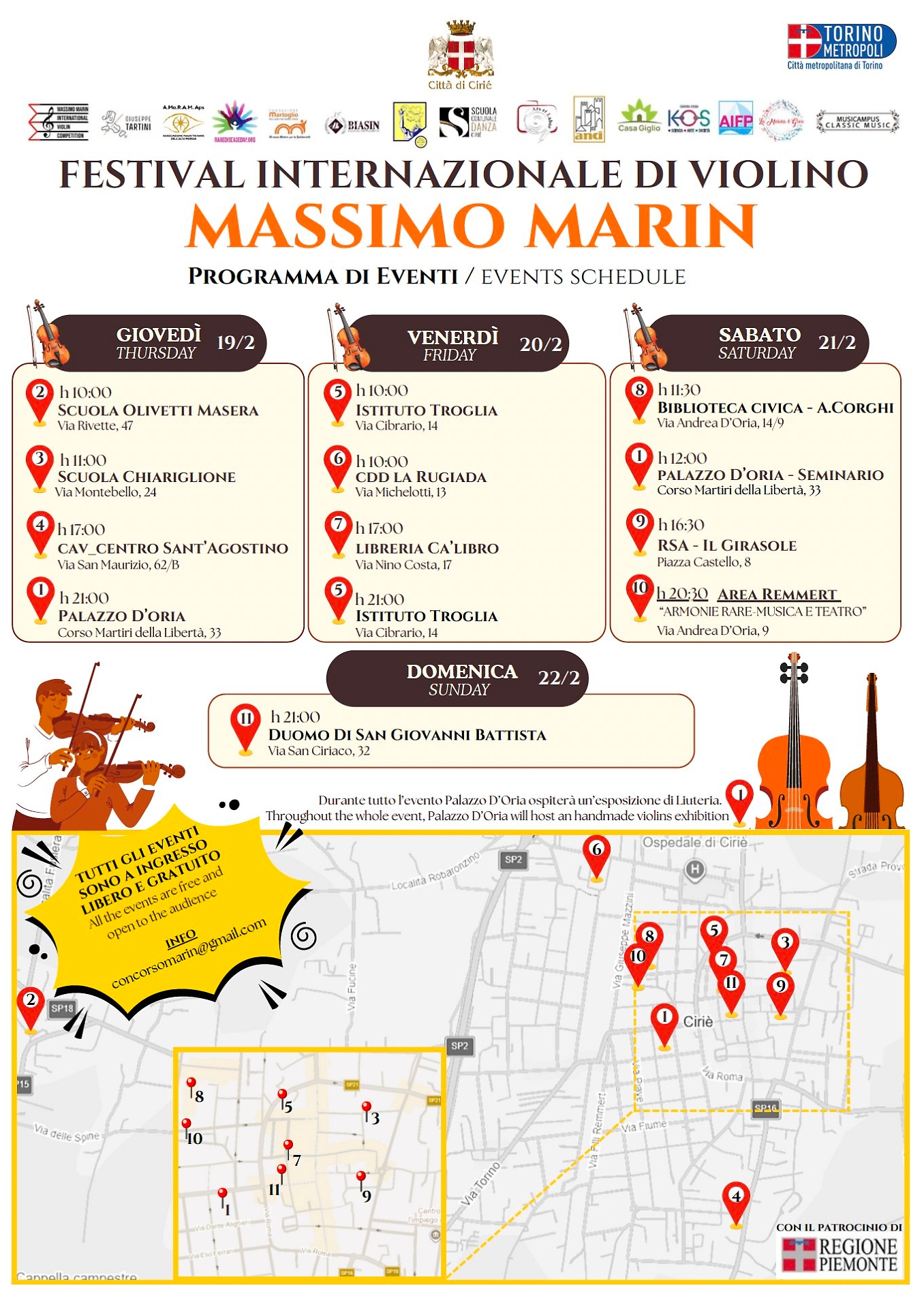 Ma il cuore del progetto è anche – e soprattutto – il Festival Internazionale di Violino, che affianca il concorso ampliandone il significato. Nei giorni della manifestazione i candidati saranno protagonisti di esibizioni diffuse in scuole, ospedali, case di riposo e librerie. La musica uscirà così dagli spazi tradizionali della competizione per incontrare persone e contesti diversi, trasformando Cirié in un palcoscenico aperto.