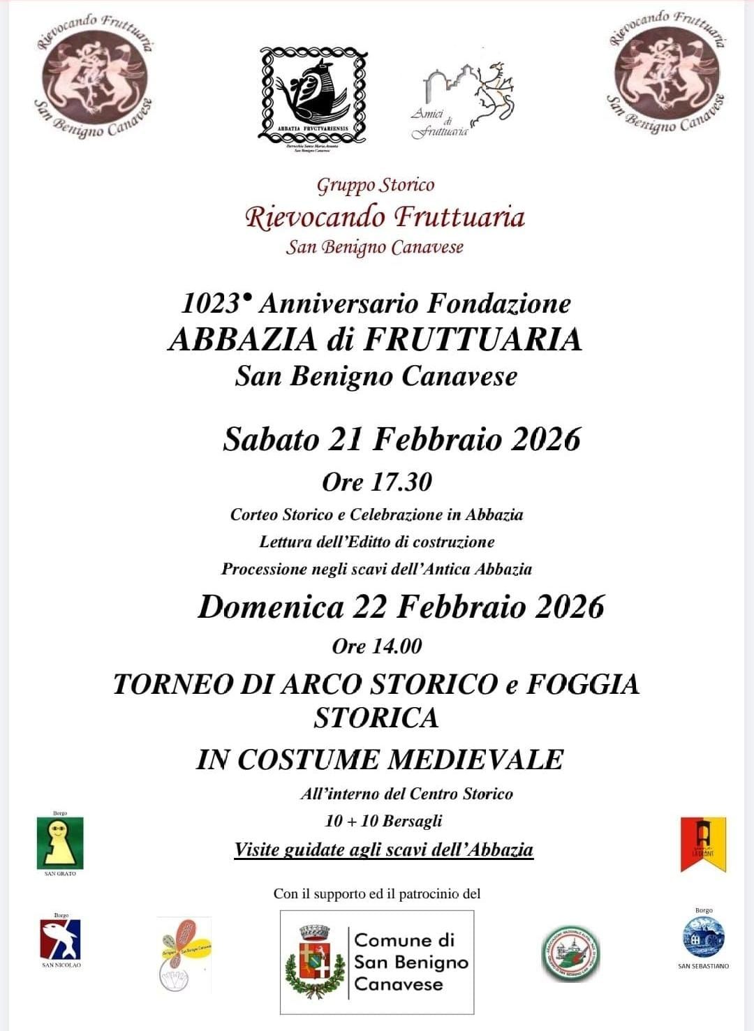 Sabato 21 e domenica 22 febbraio il paese festeggerà i 1023 anni dell’Abbazia di Fruttuaria con un ricco programma di eventi organizzati dal gruppo storico Rievocando Fruttuaria, con il supporto e il patrocinio del Comune, insieme agli Amici di Fruttuaria, alla parrocchia Santa Maria Assunta, ai borghi cittadini, all’Associazione Commercianti e al Gruppo Alpini.