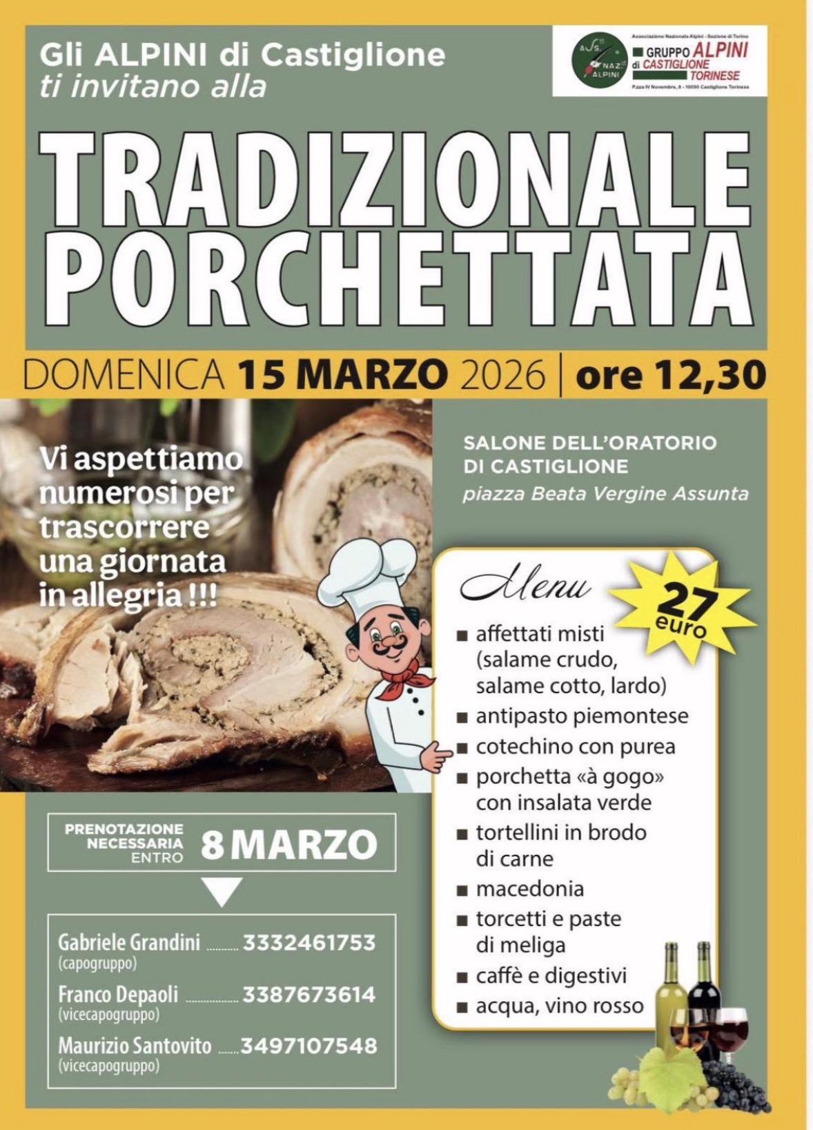 Per prendere parte alla Porchettata Castiglione 2026 è obbligatoria la prenotazione entro l’8 marzo. È possibile riservare il proprio posto contattando Gabriele Grandini, capogruppo, al 333.2461753, Franco Depaoli, vicecapogruppo, al 338.7673614, oppure Maurizio Santovito, vicecapogruppo, al 349.7107548.