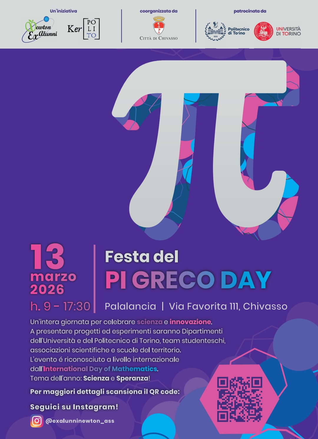 Madrina dell’evento è l’associazione Ex Alunni Newton, che coorganizza con la Città di Chivasso. Patrocini da parte di PoliTo e UniTo.