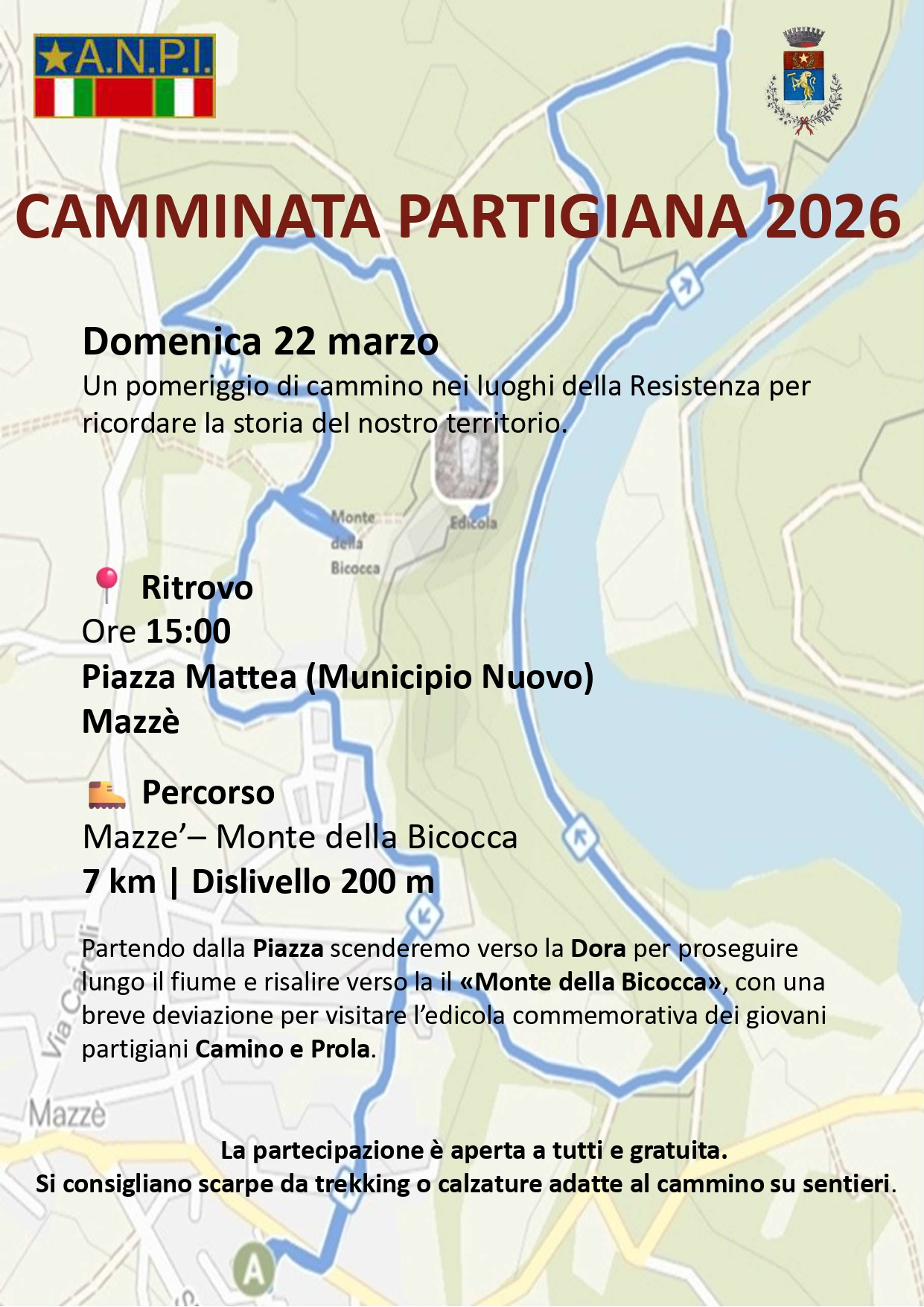 Camminare per ricordare. E farlo insieme, lungo i sentieri che custodiscono la memoria di un territorio e della sua storia. È questo lo spirito della Camminata Partigiana, in programma a Mazzè domenica 22 marzo, iniziativa promossa dall’A.N.P.I. con il patrocinio del Comune.