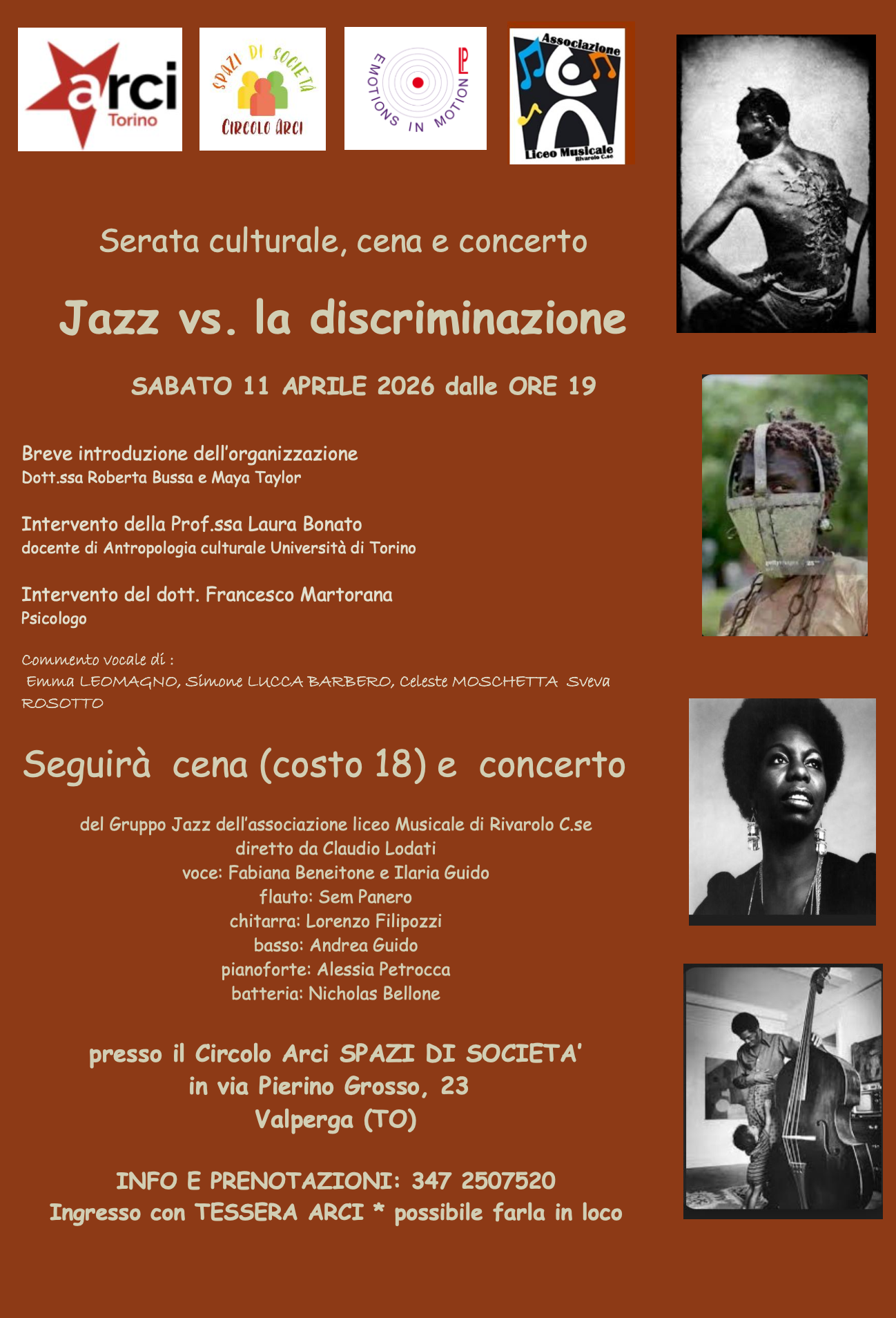 L’iniziativa, promossa da Arci Torino insieme al Circolo Arci “Spazi di Società”, Emotions in Motion LP e all’Associazione del Liceo Musicale di Rivarolo Canavese, si aprirà con una parte introduttiva e di approfondimento culturale. Interverranno la dott.ssa Roberta Bussa e Maya Taylor, seguite dal contributo della prof.ssa Laura Bonato, docente di Antropologia culturale all’Università di Torino, e dal dott. Francesco Martorana, psicologo.