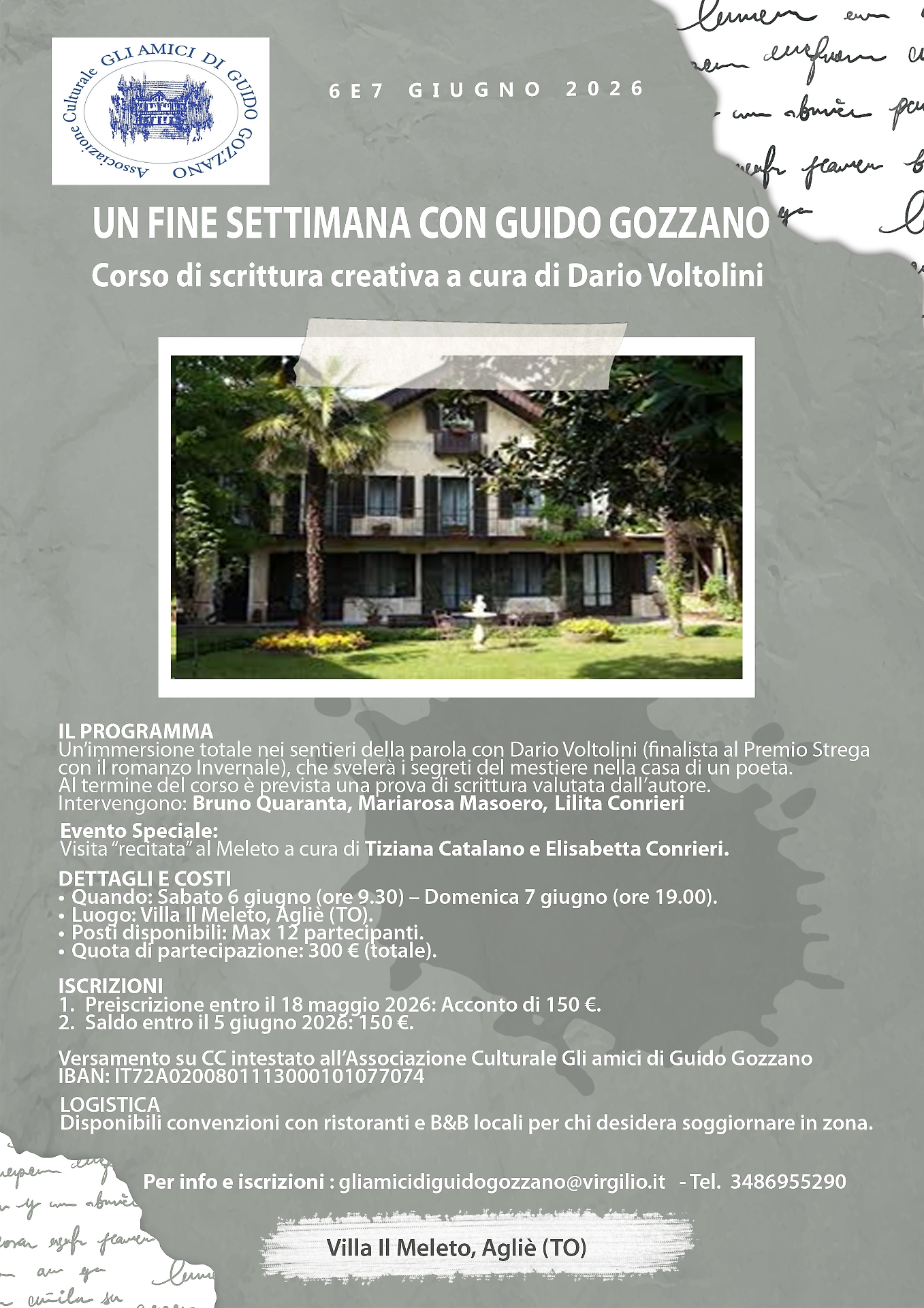 Un fine settimana dedicato alla scrittura creativa, nel luogo che più di ogni altro racconta la poesia piemontese. Ad Agliè, nella suggestiva cornice di Villa Il Meleto, torna l’appuntamento con la cultura promosso dall’associazione “Gli Amici di Guido Gozzano”: il 6 e 7 giugno 2026 è in programma un corso intensivo guidato dallo scrittore Dario Voltolini, finalista al Premio Strega.