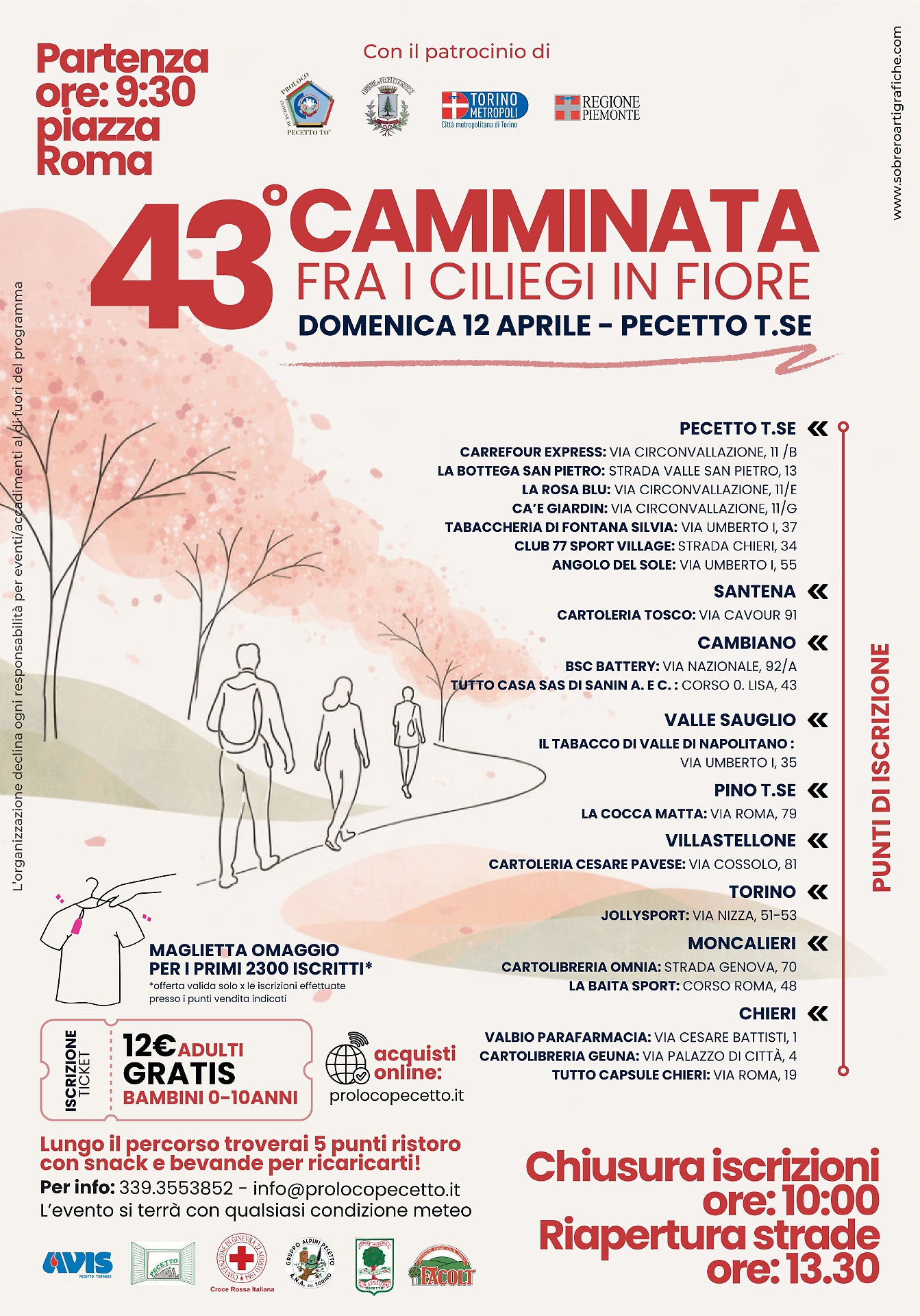 La primavera torna a colorare le colline di Pecetto e, con essa, uno degli appuntamenti più attesi del territorio: la Camminata tra i Ciliegi in Fiore. Domenica 12 aprile va in scena la 43ª edizione dell’evento, organizzato dalla Pro Loco Pecettese in collaborazione con il Comune e con il patrocinio della Città metropolitana di Torino.