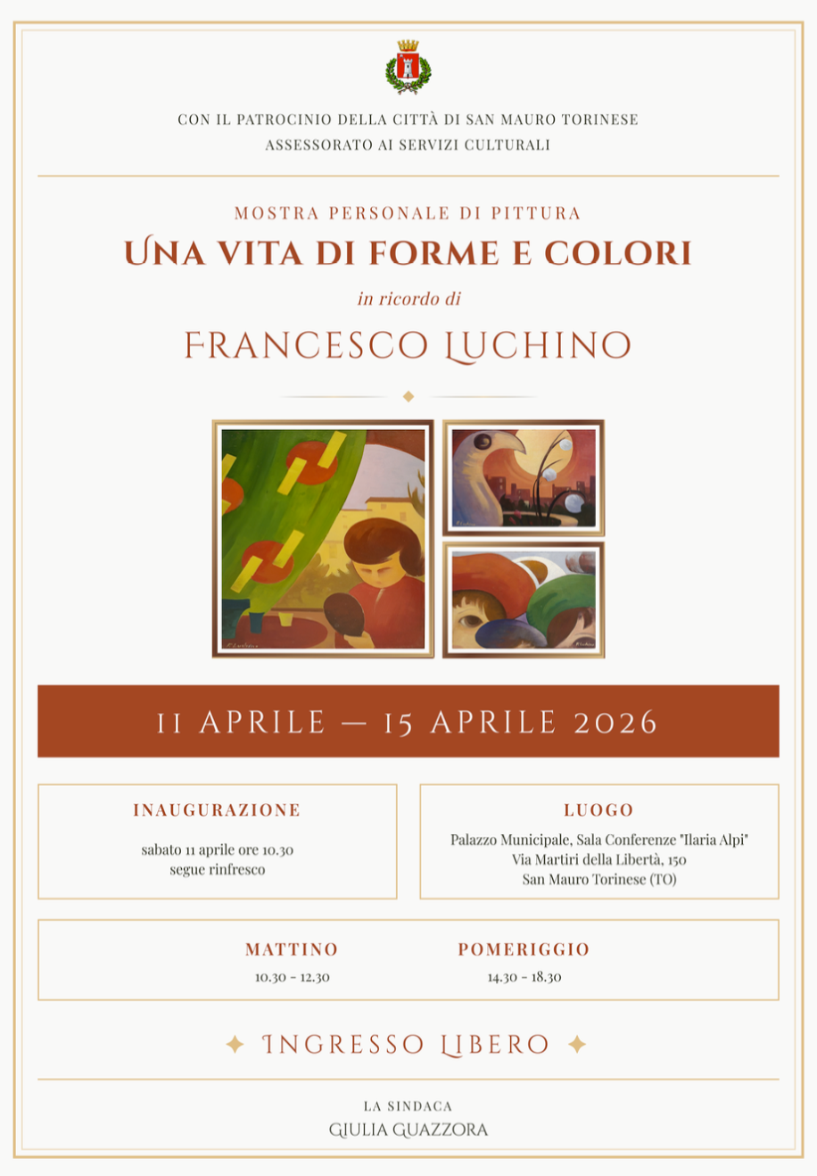 La mostra dedicata a Francesco Luchino arriva a San Mauro Torinese come un omaggio diretto, radicato nel territorio dove l’artista ha vissuto e lavorato per tutta la vita. Dall’11 al 15 aprile 2026, il Palazzo Municipale, nella Sala Conferenze “Ilaria Alpi”, ospiterà la personale dal titolo “Una vita di forme e colori”, promossa con il patrocinio della città e dell’Assessorato ai Servizi Culturali .