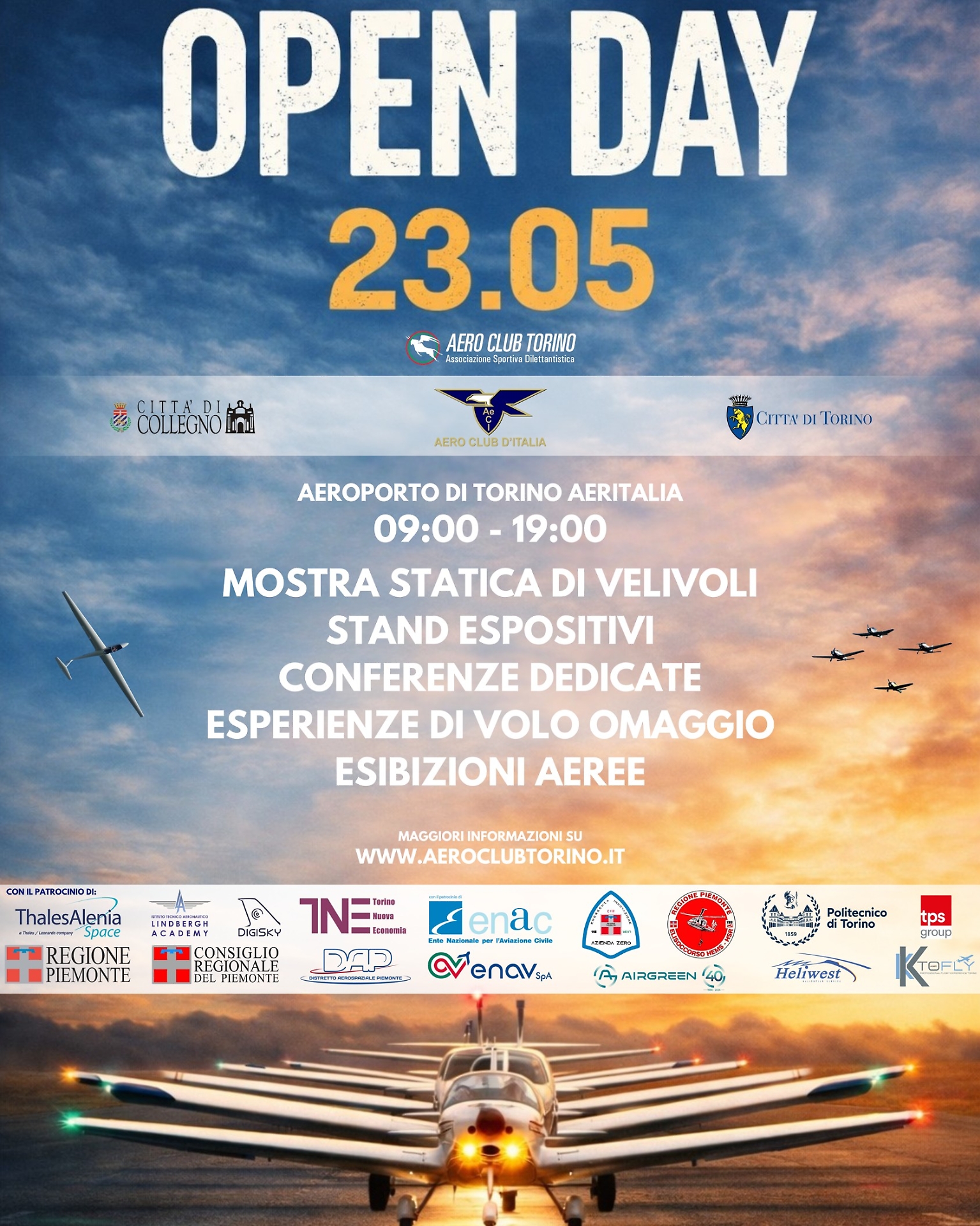 Una giornata per sognare, imparare e, soprattutto, volare. Sabato 23 maggio 2026, dalle 9 alle 19, l’Aero Club Torino aprirà gratuitamente le porte dell’aeroporto di Torino Aeritalia, a Collegno, per l’atteso Open Day 2026. Un evento che, nelle passate edizioni, ha già richiamato migliaia di appassionati, famiglie e studenti.