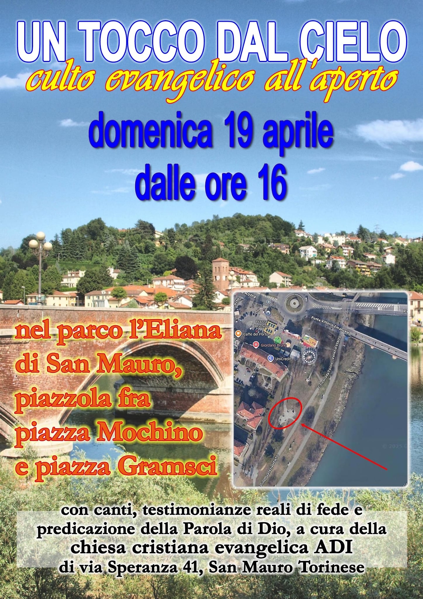 Domenica 19 aprile, a partire dalle ore 16, il Parco l’Eliana di San Mauro Torinese tornerà a ospitare “Un tocco dal cielo”, il culto evangelico all’aperto promosso dalla Chiesa Cristiana Evangelica ADI di via Speranza. L’appuntamento è fissato nella piazzola tra piazza Mochino e piazza Gramsci, in uno dei punti più frequentati e simbolici della città, affacciato sul Po.