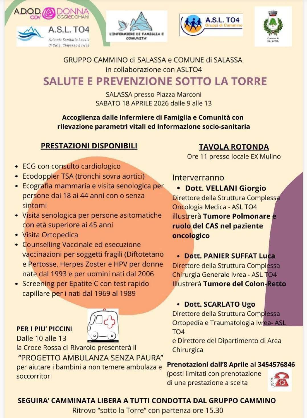 Una piazza che si trasforma in un presidio di prevenzione, un’intera comunità coinvolta e servizi sanitari gratuiti a portata di mano. Sabato 18 aprile, dalle 9 alle 13 in piazza Marconi, andrà in scena “Salute e Prevenzione sotto la Torre”, un’iniziativa che mette al centro il benessere dei cittadini grazie alla sinergia tra istituzioni e realtà del territorio. A promuovere l’evento sono il Gruppo Cammino di Salassa, il Comune, l’Asl To4, Adod Donna e l’Infermiere di famiglia e comunità, con l’obiettivo di rendere la salute più accessibile e vicina alle persone.