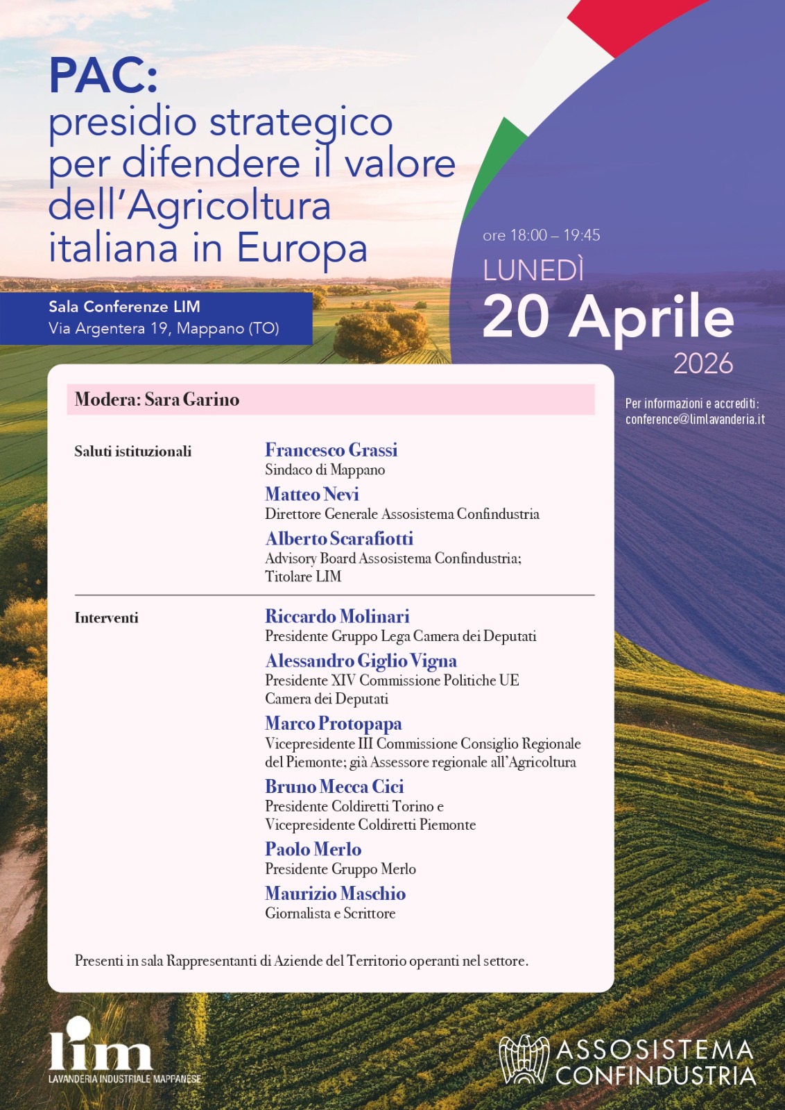 L’agricoltura piemontese torna al centro del confronto politico ed economico con un convegno che mette insieme istituzioni, imprese e rappresentanze del settore. Lunedì 20 aprile 2026, dalle 18.00 alle 19.45, la Sala Conferenze LIM di Mappano, in via Argentera 19, ospiterà l’incontro dal titolo “PAC: presidio strategico per difendere il valore dell’Agricoltura italiana in Europa”.