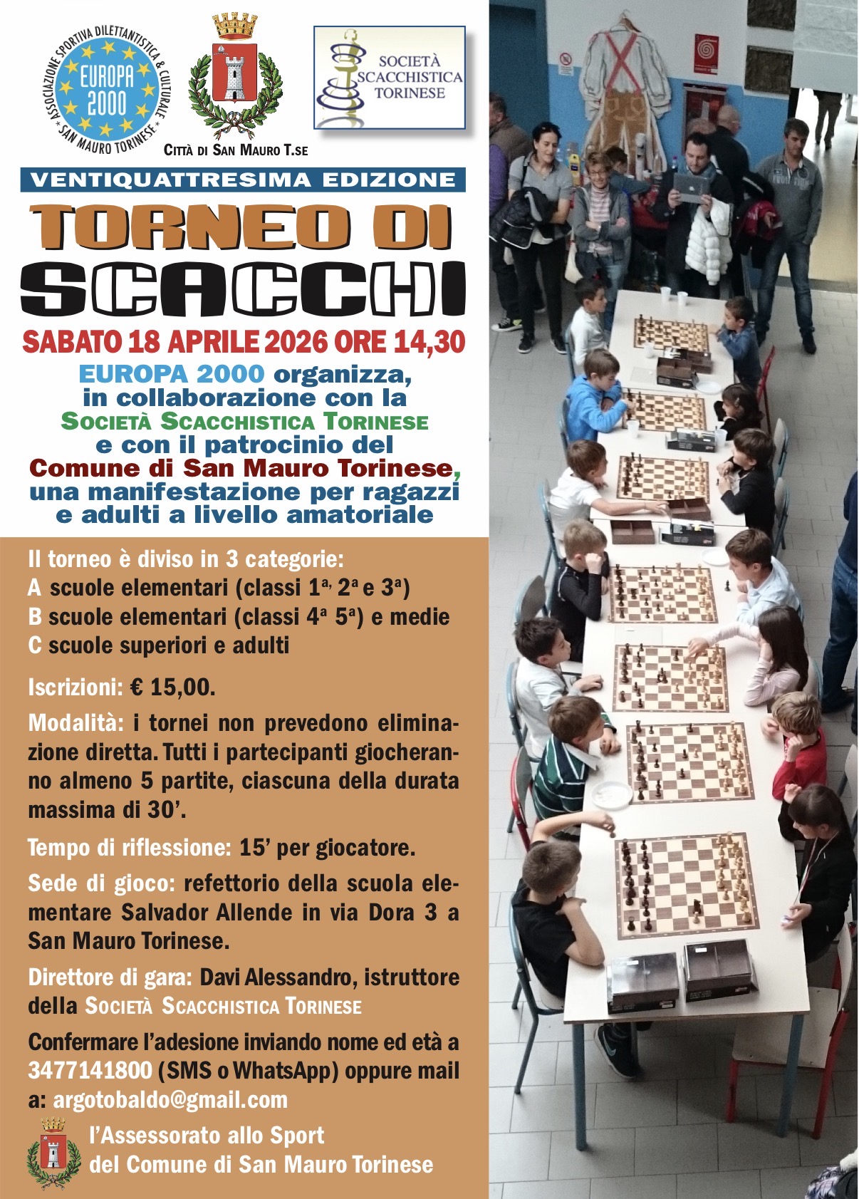 La manifestazione è organizzata dall’associazione Europa 2000, in collaborazione con la Società Scacchistica Torinese e con il patrocinio del Comune di San Mauro Torinese, confermando una sinergia consolidata negli anni per promuovere il gioco degli scacchi sul territorio.