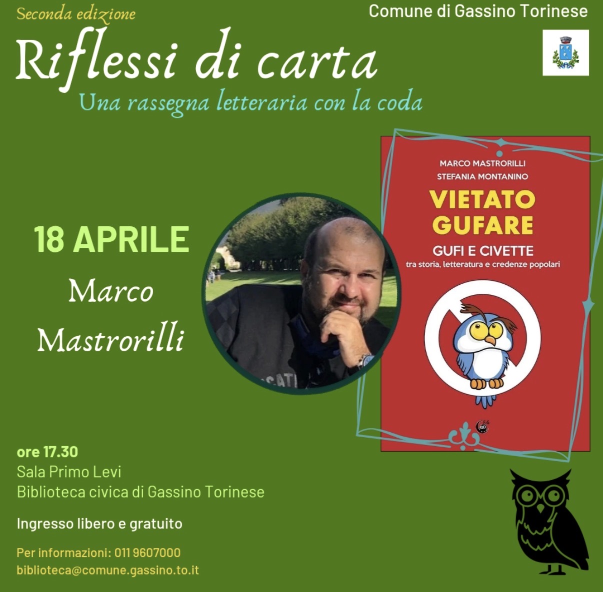 Sabato 18 aprile, alle 17.30, nella Sala Primo Levi della Biblioteca civica, sarà ospite Marco Mastrorilli con il libro “Vietato gufare! Gufi e civette tra storia, letteratura e credenze popolari”.