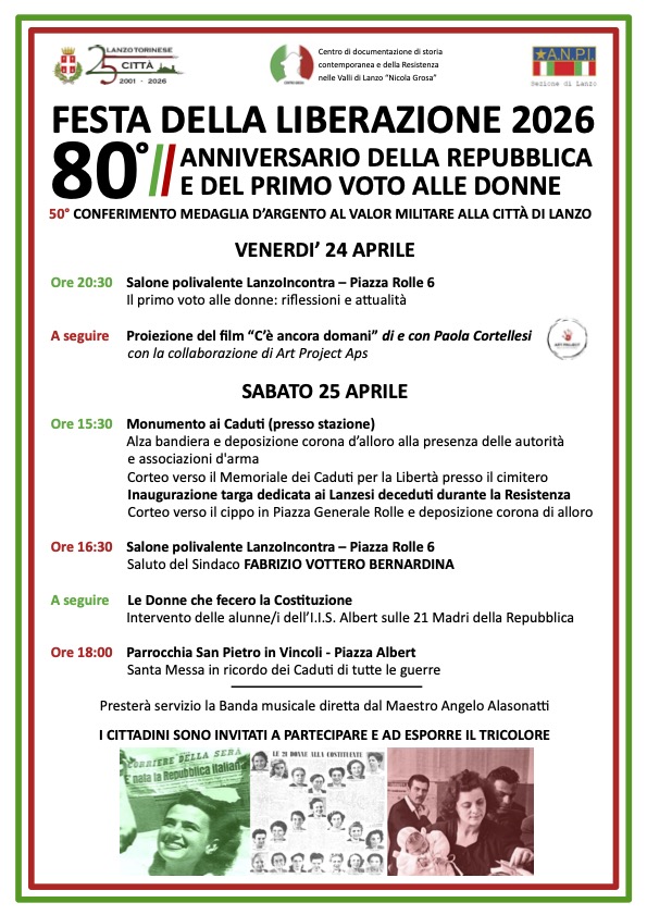 Le celebrazioni si svilupperanno nell’arco di due giorni, tra momenti istituzionali, riflessioni storiche e iniziative culturali. Il primo appuntamento è in programma venerdì 24 aprile, alle 20.30, al salone polivalente LanzoIncontra. Qui si terrà l’incontro “Il primo voto alle donne: riflessioni e attualità”, seguito dalla proiezione del film “C’è ancora domani” di Paola Cortellesi, in collaborazione con Art Project. Un’occasione per approfondire un passaggio fondamentale della storia italiana e il ruolo delle donne nella costruzione della democrazia.
