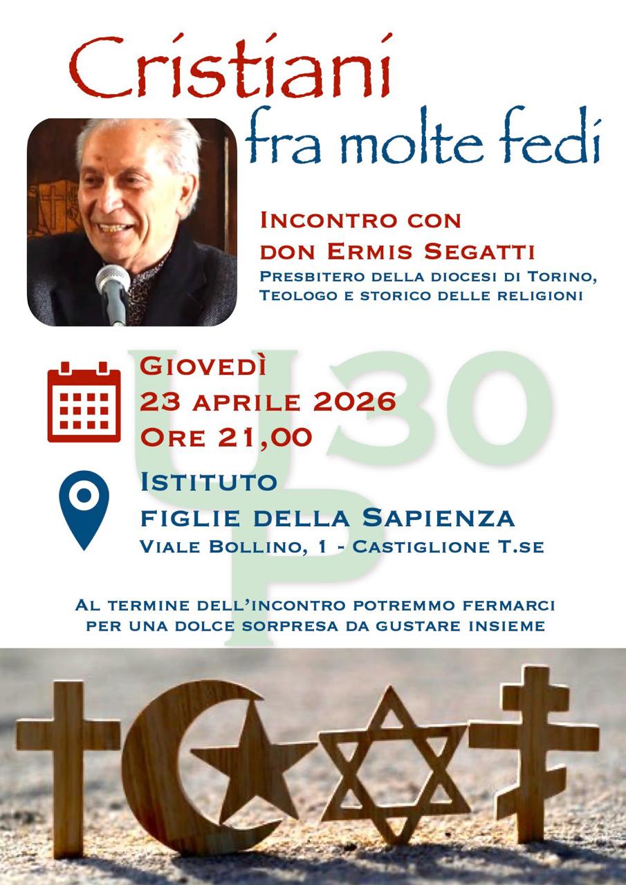 Giovedì 23 aprile 2026, alle ore 21, all’Istituto Figlie della Sapienza in viale Bollino 1 a Castiglione Torinese, è in programma l’incontro dal titolo “Cristiani tra altre fedi”, con protagonista don Ermis Segatti, presbitero della diocesi di Torino, teologo e storico delle religioni.