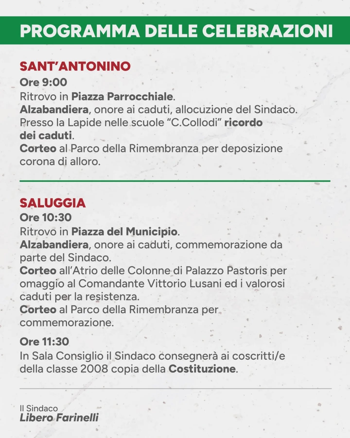 A Sant’Antonino le celebrazioni prenderanno il via alle 9 del mattino con il ritrovo in piazza parrocchiale. Da qui partirà il primo momento simbolico della giornata: l’alzabandiera, accompagnato dall’onore ai caduti e dall’allocuzione del sindaco. Un passaggio che segna l’avvio ufficiale della cerimonia e che richiama il significato più profondo della ricorrenza.