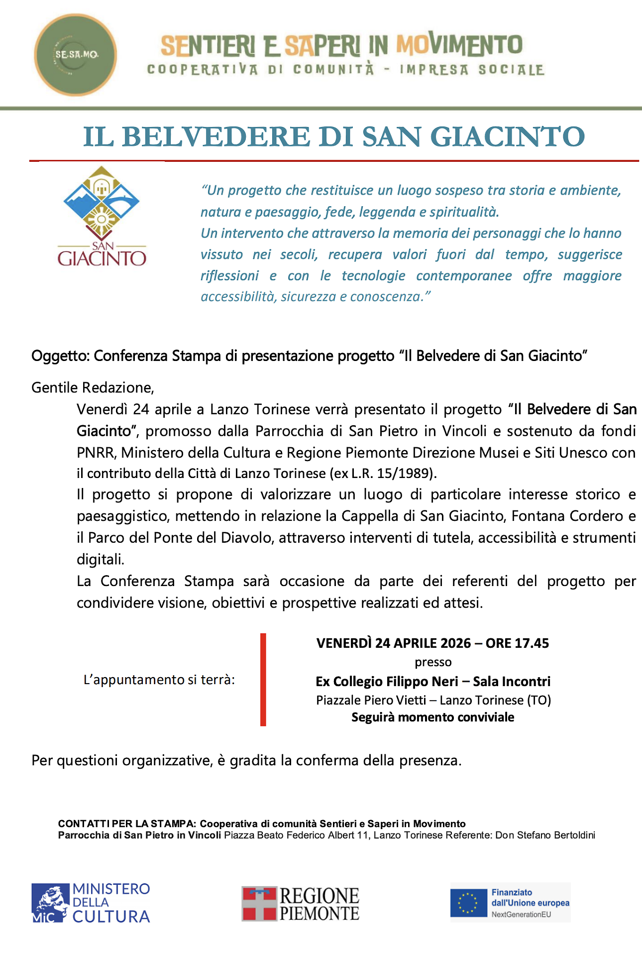 Un luogo sospeso tra passato e presente, tra paesaggio e memoria, pronto a tornare protagonista. A Lanzo Torinese prende forma il progetto “Il Belvedere di San Giacinto”, un intervento che punta a recuperare e valorizzare uno degli angoli più suggestivi del territorio, mettendo in relazione storia, ambiente e nuove tecnologie. La presentazione ufficiale è in programma venerdì 24 aprile alle 17.45, nella Sala incontri dell’ex Collegio Filippo Neri .