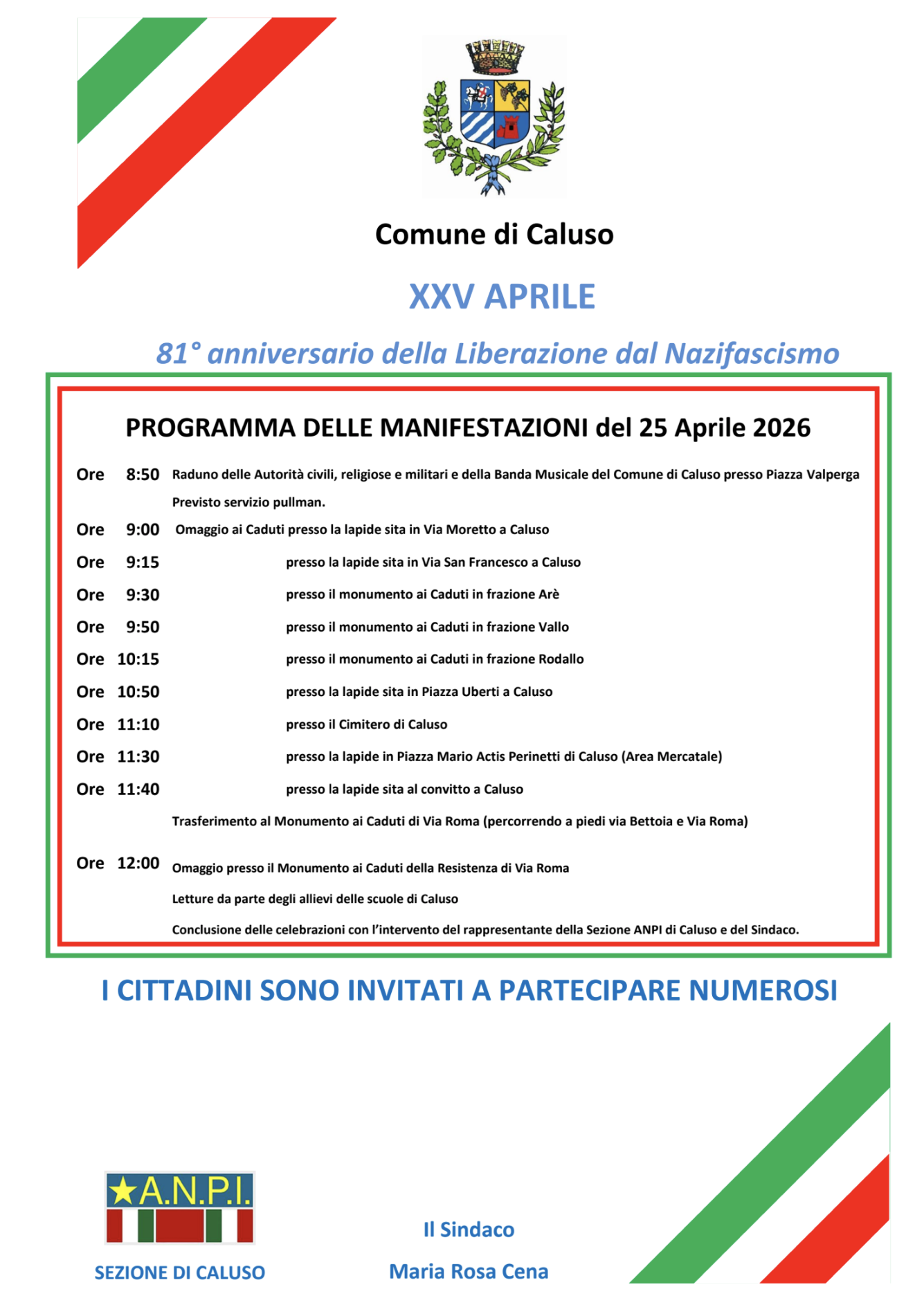 Particolarmente significativo sarà il coinvolgimento delle nuove generazioni. Durante la cerimonia finale, infatti, sono previste letture da parte degli studenti delle scuole di Caluso, un segnale concreto di come la memoria della Liberazione venga trasmessa anche attraverso il contributo dei più giovani.