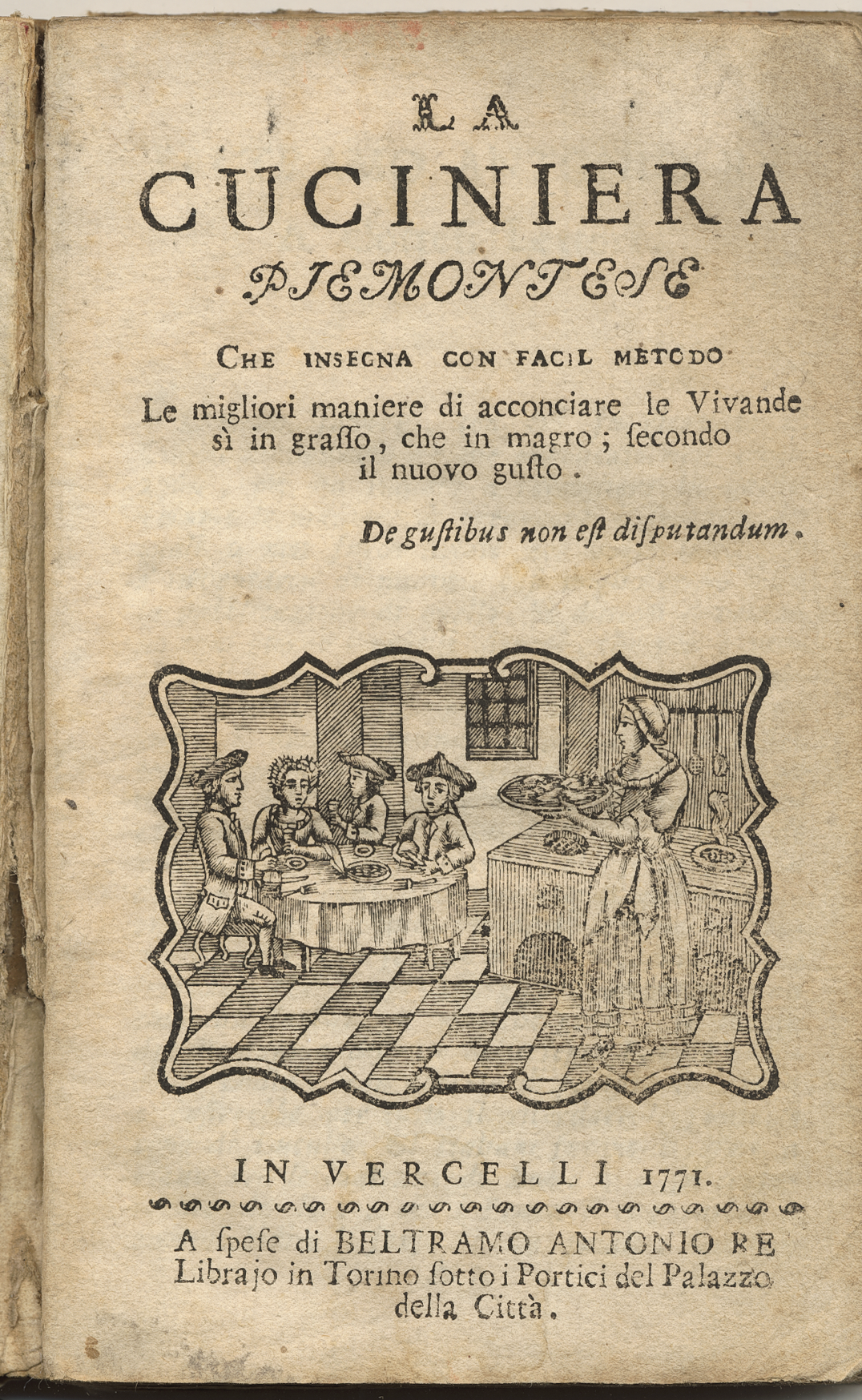La cucina piemontese trova spazio attraverso volumi storici che ne raccontano l’affermazione, a partire dalla seconda metà del Settecento, mentre i menù d’epoca accompagnano il visitatore in un viaggio nella ristorazione torinese, soprattutto durante la Belle Époque.
