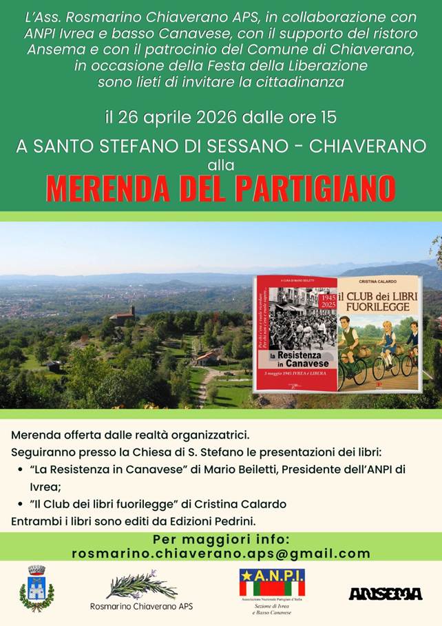Accanto alla convivialità, non mancherà l’approfondimento culturale. Dopo la merenda, sono previste le presentazioni di due volumi dedicati alla memoria e alla storia della Resistenza: “La Resistenza in Canavese” di Mario Beiletti e “Il club dei libri fuorilegge” di Cristina Calardo. Un’occasione per riflettere, anche attraverso la narrazione, su un periodo che continua a interrogare il presente.