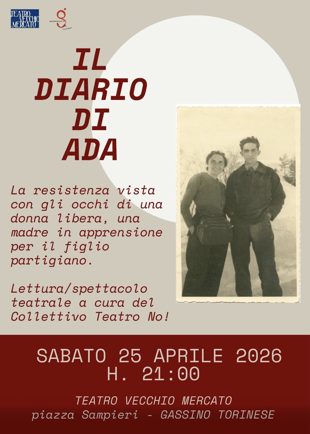 Sabato 25 aprile 2026, alle 21, il Teatro Vecchio Mercato ospita “Il diario di Ada”, lettura-spettacolo proposta dal Collettivo Teatro NO!, all’interno del progetto “ANTIFASCISTA”. Il testo prende forma dal Diario partigiano di Ada Prospero Marchesini Gobetti, figura centrale della Resistenza italiana.