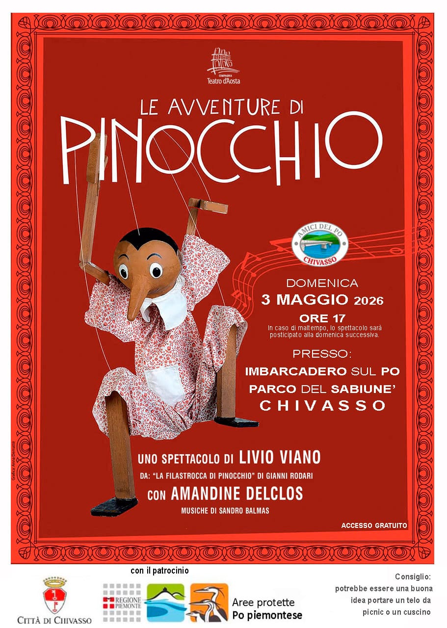 Pinocchio arriva a Chivasso e lo fa sulle rive del Po: domenica 3 maggio 2026 alle ore 17 l’imbarcadero del Parco del Sabiuné ospita lo storico spettacolo del Teatro d’Aosta. Un appuntamento gratuito che porta in città uno dei progetti teatrali più particolari del momento, nato per celebrare i 200 anni dalla nascita di Carlo Collodi.