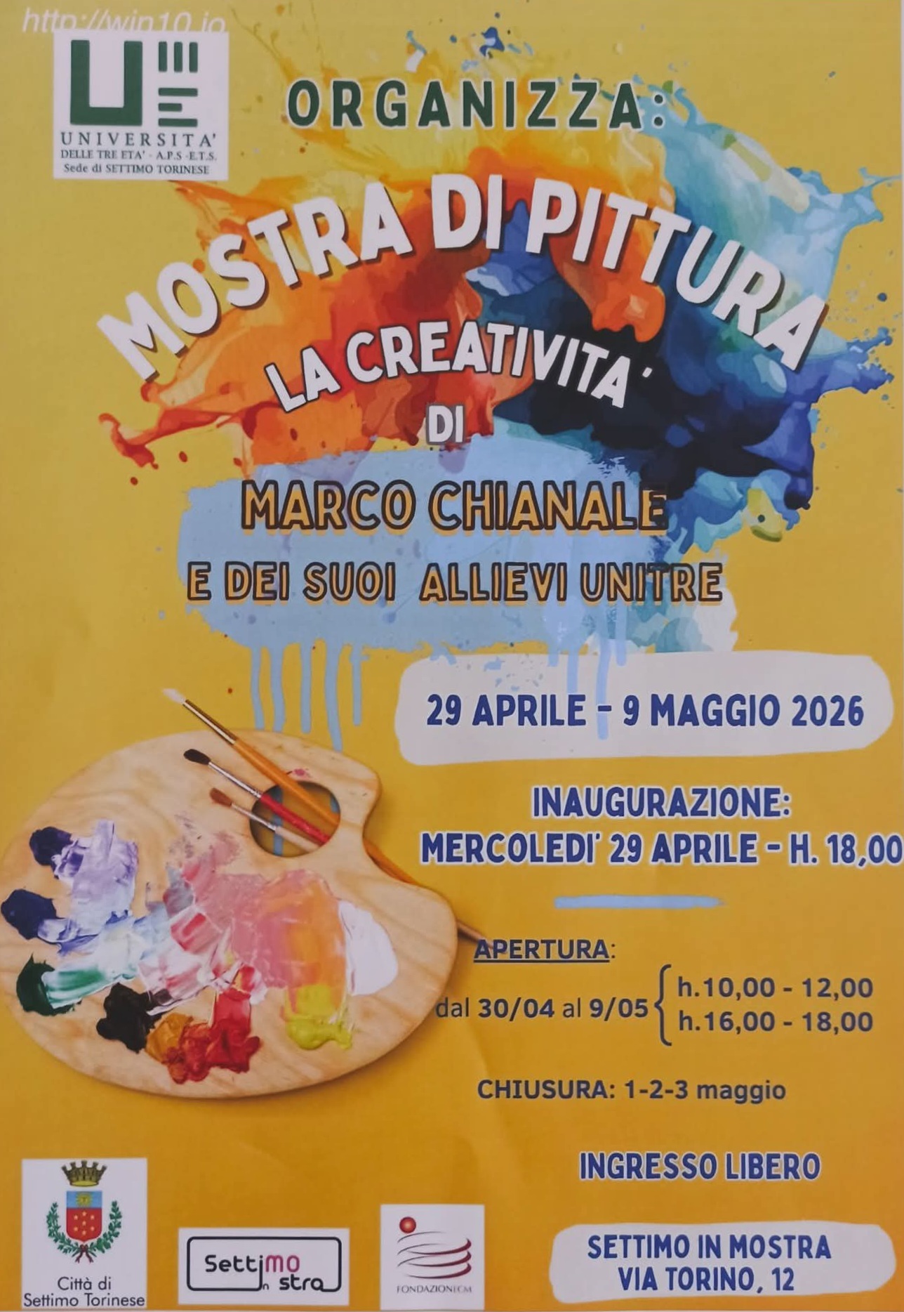 Mercoledì 29 aprile alle ore 18, presso “Settimo in Mostra”, il nuovo spazio culturale ed espositivo di Settimo Torinese sito in via Torino 12, si inaugurerà la mostra collettiva degli allievi che seguono il corso di pittura dell’Università delle Tre Età.