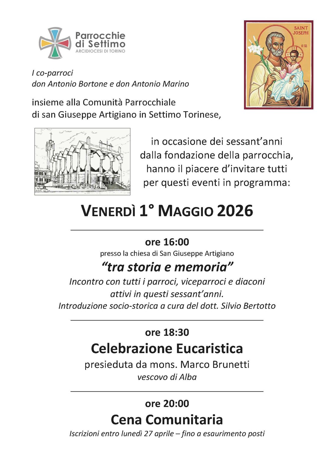 Sessant’anni di storia, fede e vita condivisa. A Settimo Torinese la parrocchia di San Giuseppe Artigiano si prepara a celebrare un traguardo importante con una giornata pensata per riunire la comunità e ripercorrere le tappe di un percorso che ha segnato intere generazioni.
