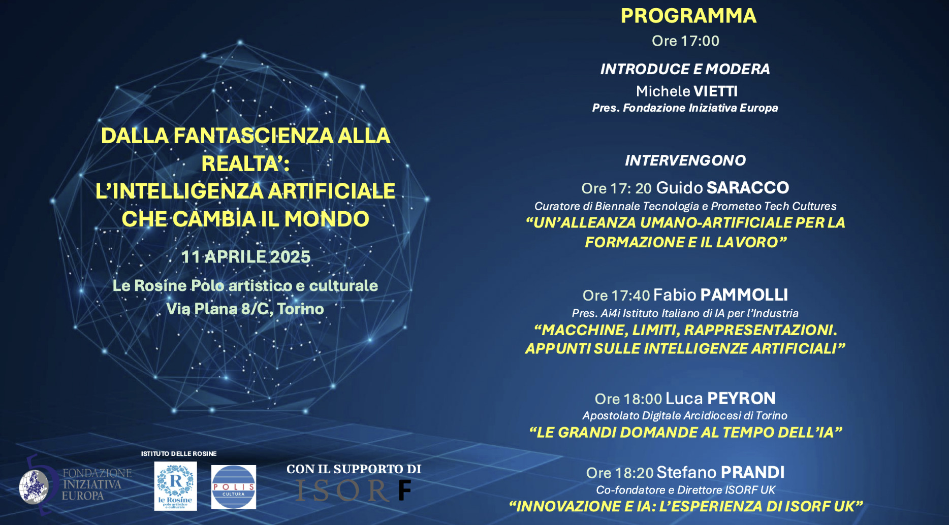 Per questo venerdì 11 aprile 2025, alle ore 17, il Polo Artistico e Culturale "Le Rosine" di Torino (Via Plana 8/C) ospiterà il convegno “Dalla fantascienza alla realtà: l’intelligenza artificiale che cambia il mondo”, promosso dalla Fondazione Iniziativa Europa, in collaborazione con Polis Cultura e con il supporto di ISORF.