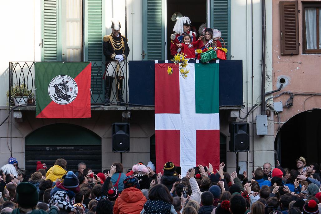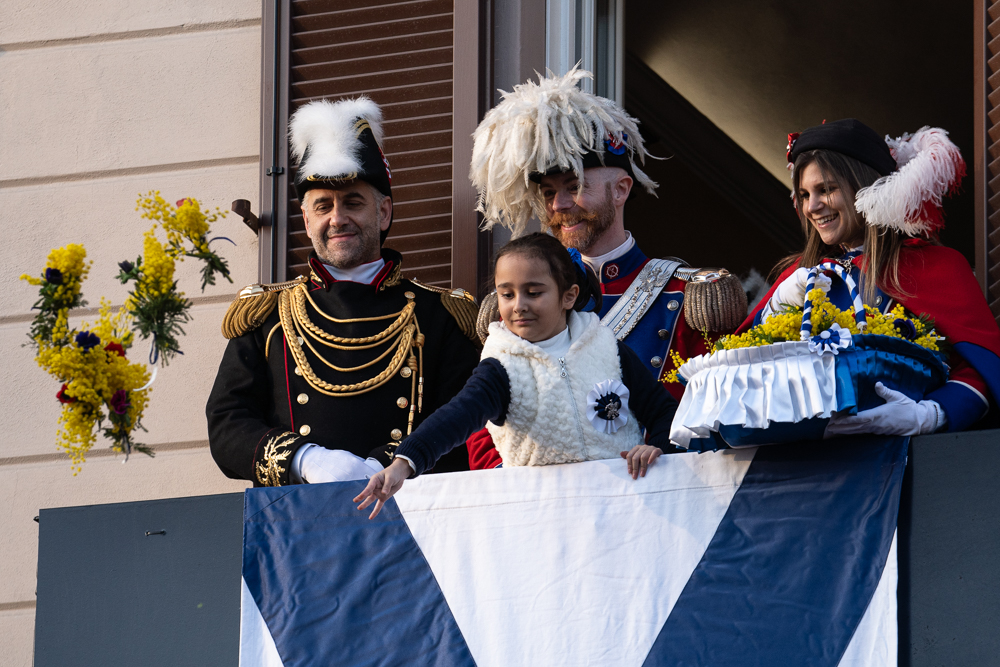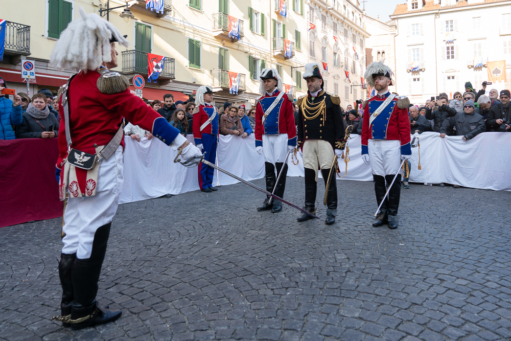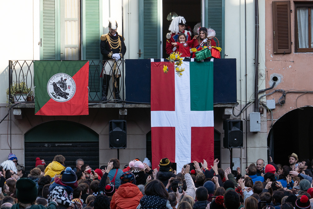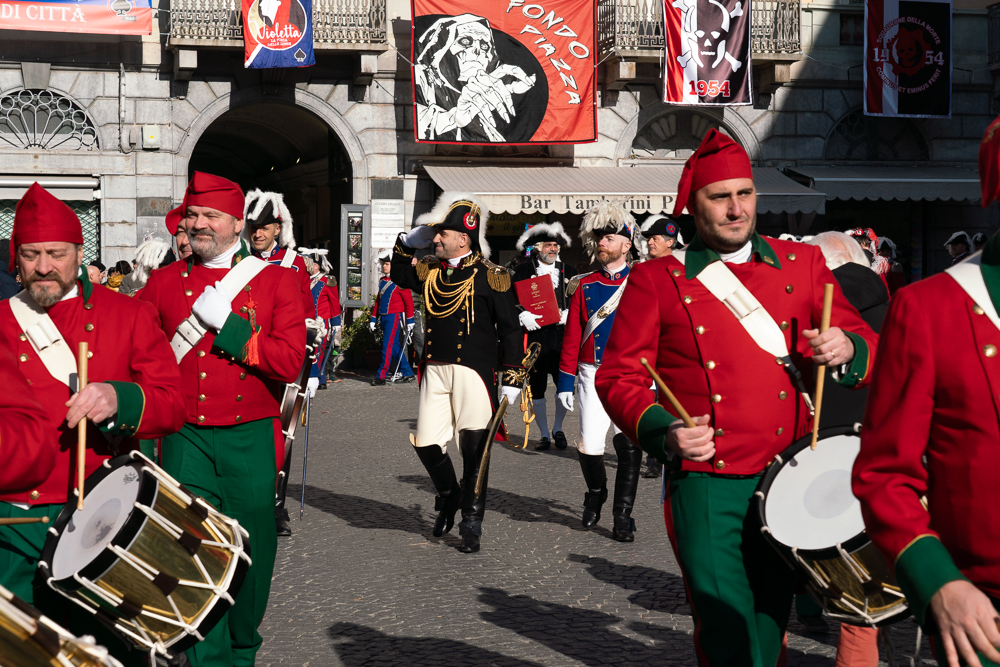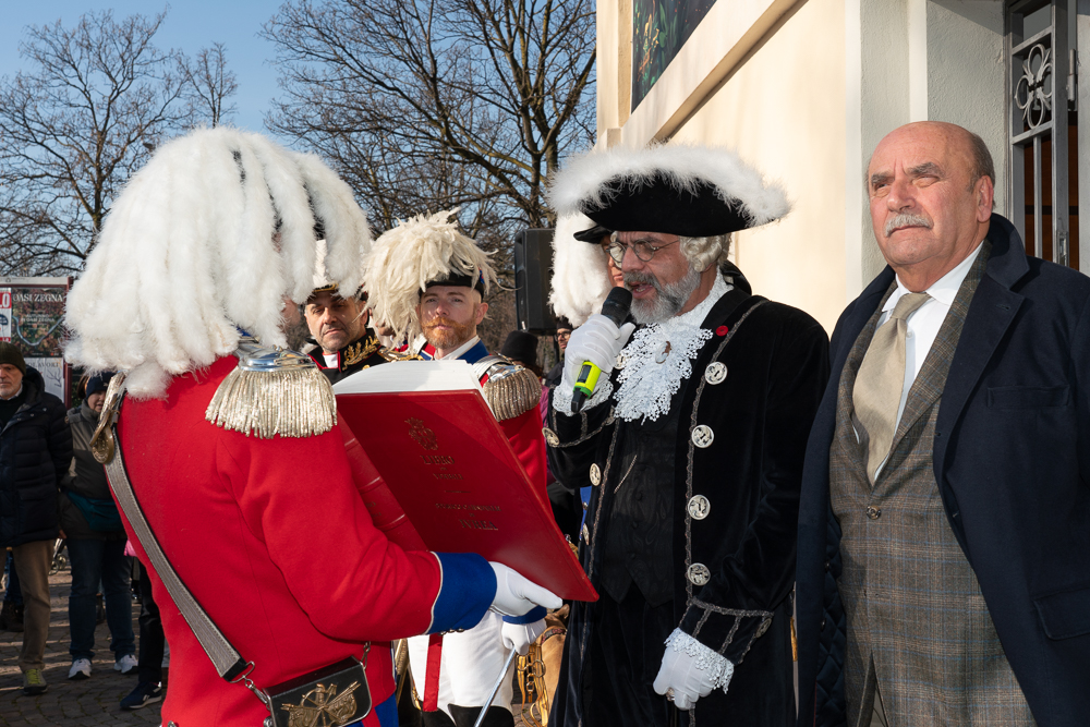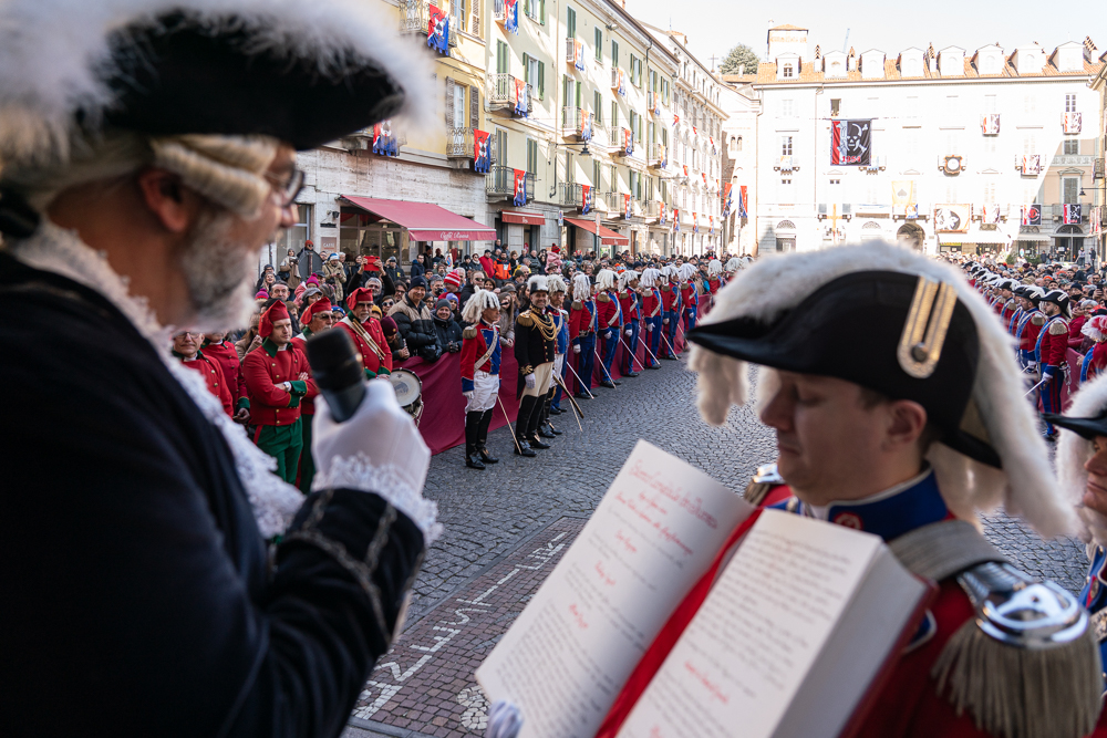 In Piazza Freguglia si è svolta poi la Presa in consegna del Libro dei Verbali, la cerimonia che sancisce la consegna del Libro dei Verbali dal Cancelliere al suo Sostituto, affinché lo conservi per tutto il periodo carnevalesco dando pubblica lettura di quanto in esso annotato. A seguire in piazza di città si è svolta la Prise du Drapeau, cerimonia militare della consegna della bandiera all’Alfiere dello Stato Maggiore all’inizio di ogni Campagna.