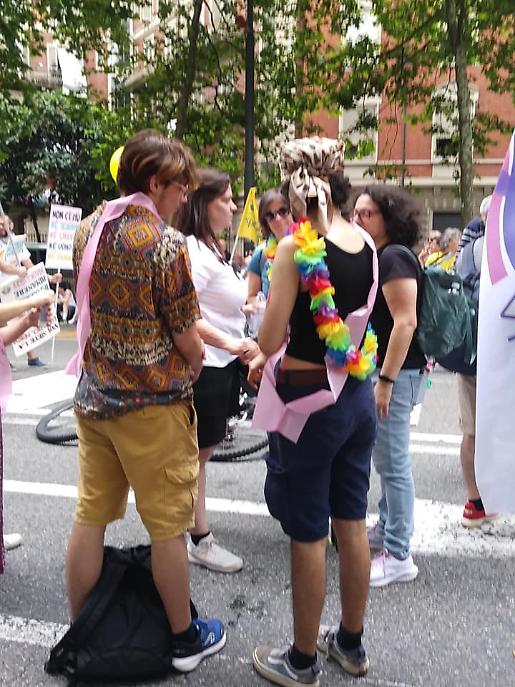 Non sono mancati però i momenti critici. Alcune attiviste del collettivo femminista francese di destra Collective Némésis si sono piazzate davanti alla testa del corteo, con uno striscione contro la gestazione per altri. Il coordinatore Luca Minici, per evitare tensioni, le ha invitate ad unirsi pacificamente alla parata. Le militanti hanno sfilato per pochi minuti, ma sono poi state accompagnate fuori dal corteo per evitare ulteriori contestazioni. Il loro messaggio, riportato dalle agenzie, era chiaro: “Chiamano femminismo l’utero in affitto: affittare ai poveri per consegnare ai ricchi. La commercializzazione del corpo della donna non è e non sarà mai femminista”.