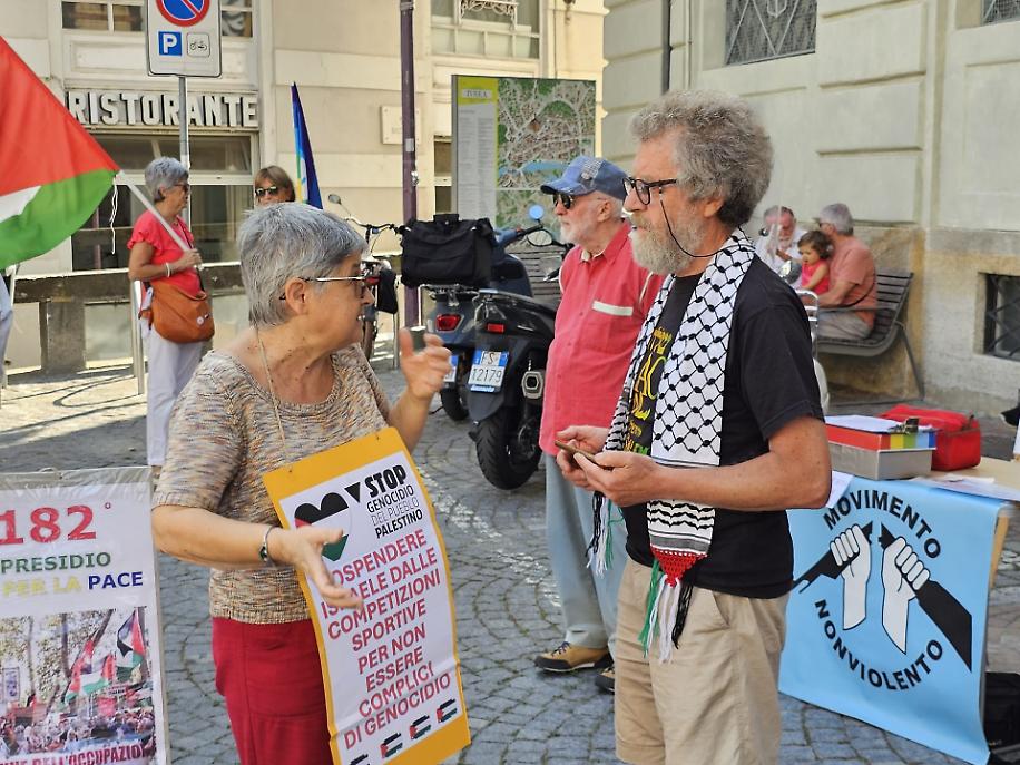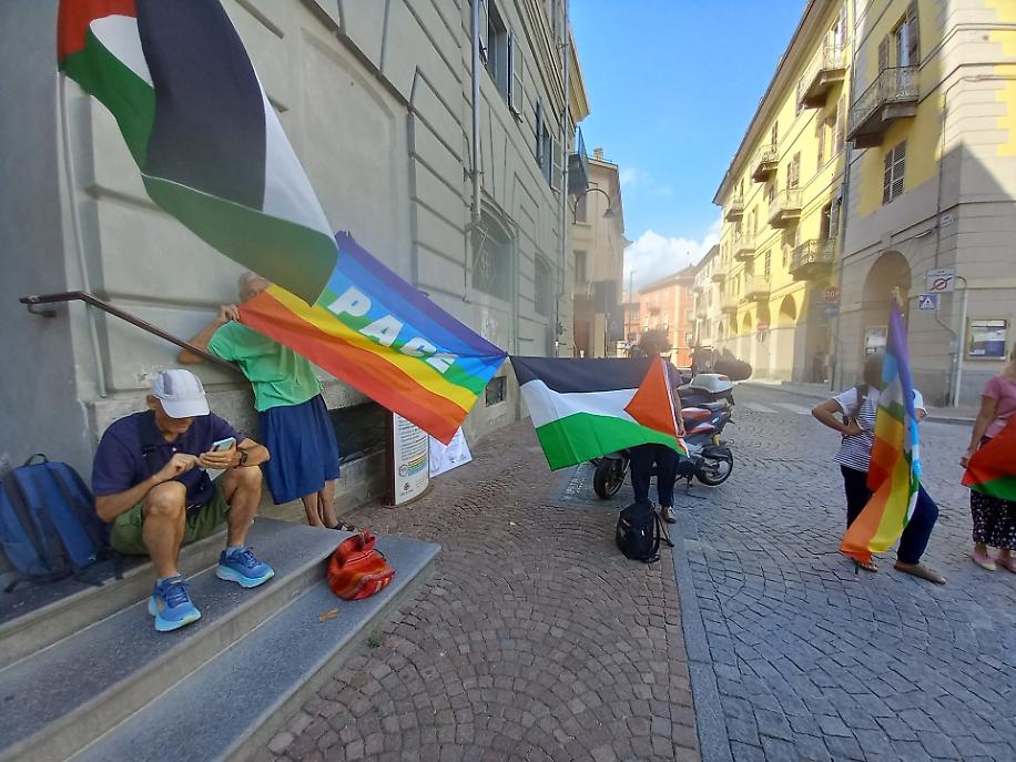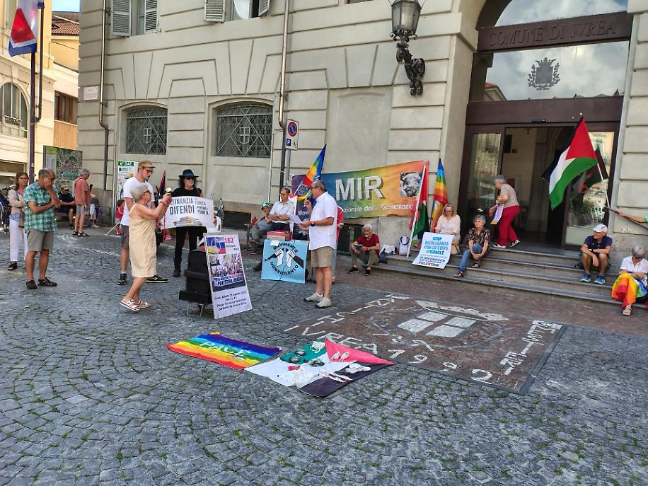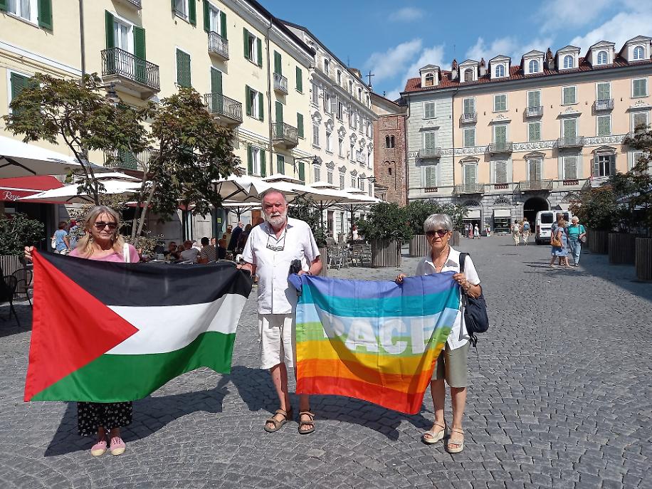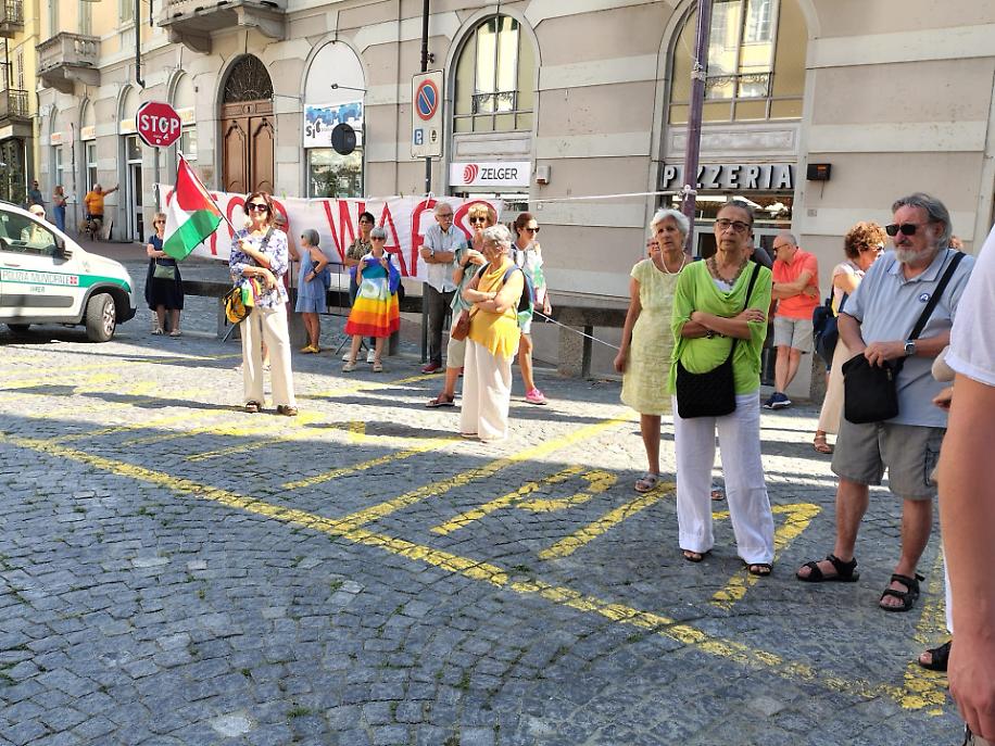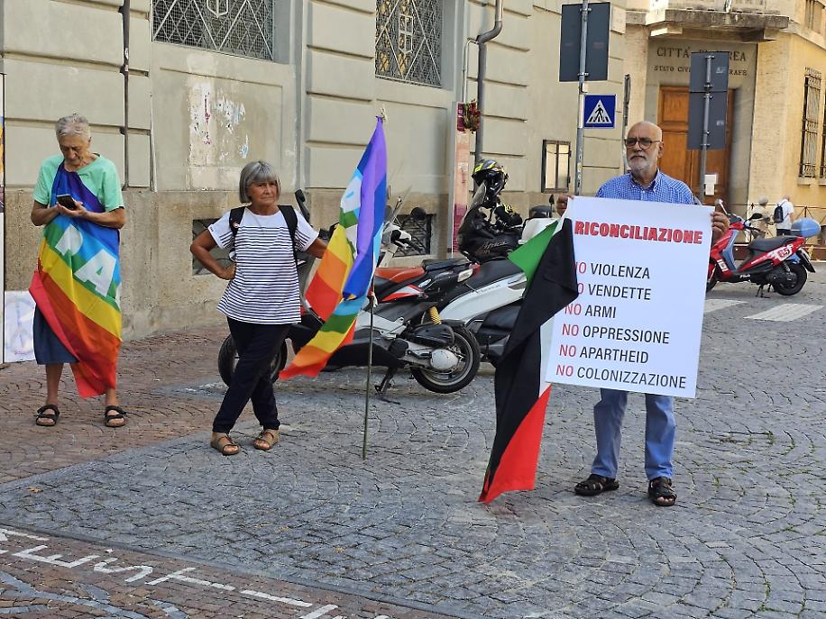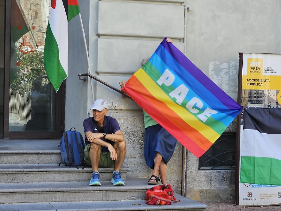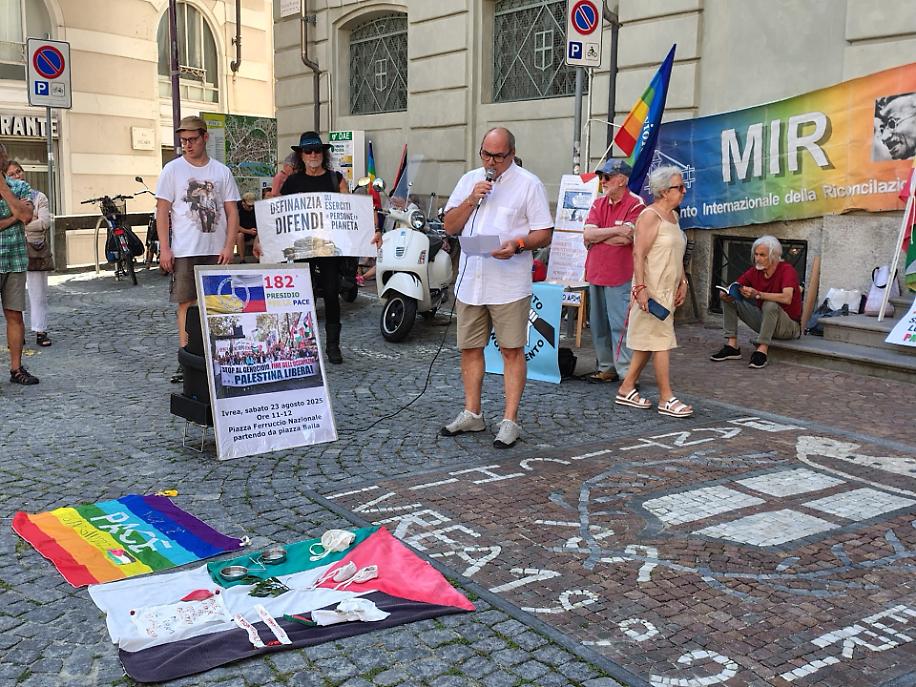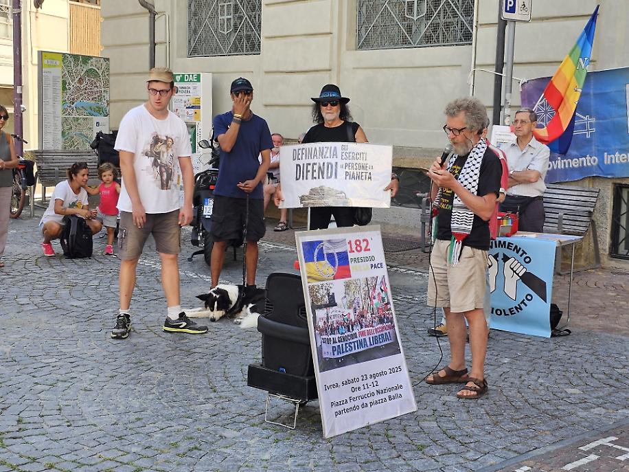 Sabato 23 agosto. A Ivrea passa la Vuelta di Spagna: la città si riempie di applausi, di bandiere, di biciclette che sfrecciano veloci. Ma lungo lo stesso percorso, tra i tifosi che acclamano i corridori, c’è anche un gruppo di cittadini che non guarda alla gloria sportiva, bensì alla tragedia umana che insanguina il mondo. Con cartelli e parole semplici, invocano la fine di tutte le guerre. È così che prende forma il 182° presidio per la pace, quell’appuntamento che da oltre due anni, con ostinata continuità e una resilienza senza paragoni, scandisce ogni sabato eporediese come un battito regolare di coscienza collettiva.