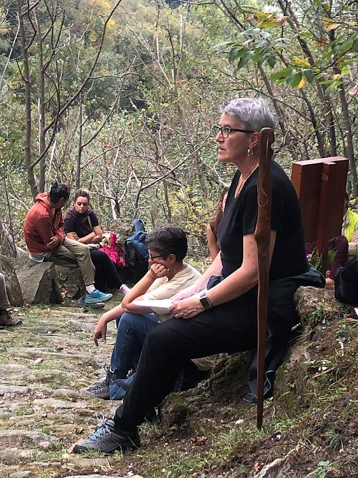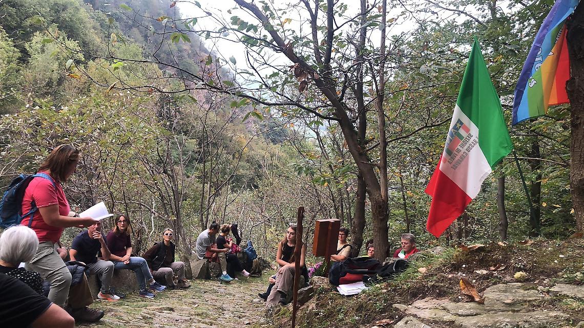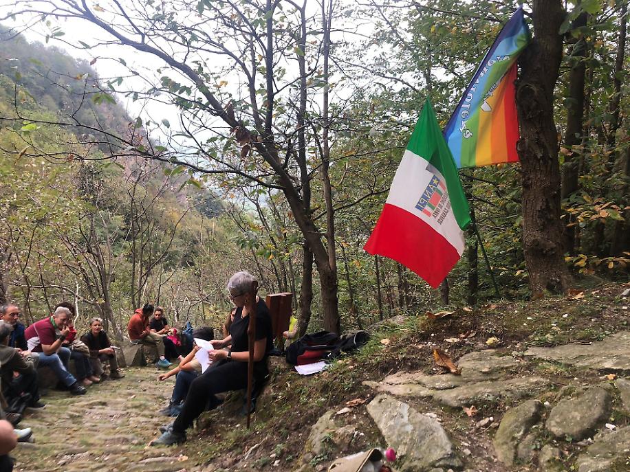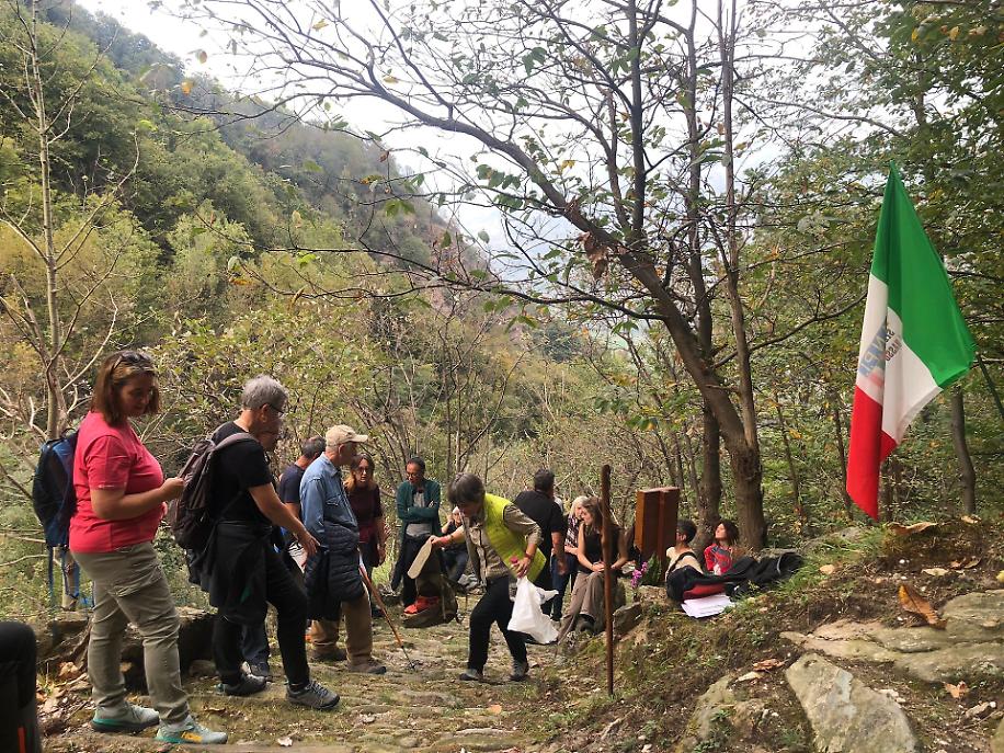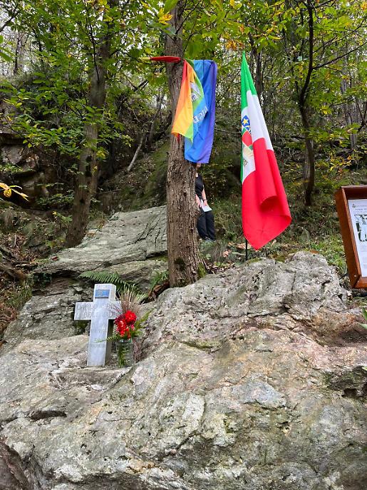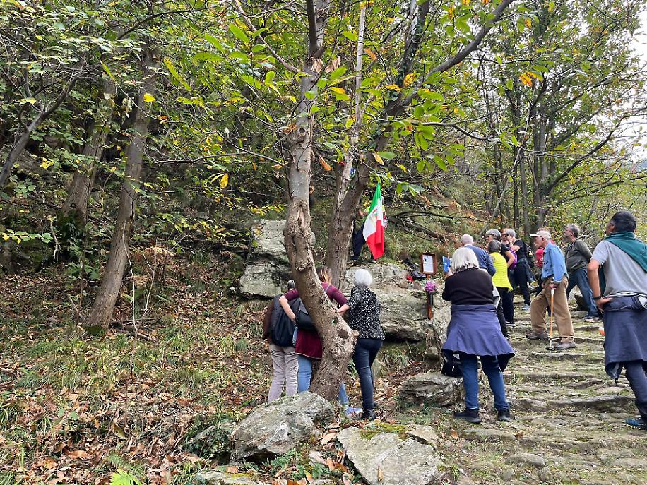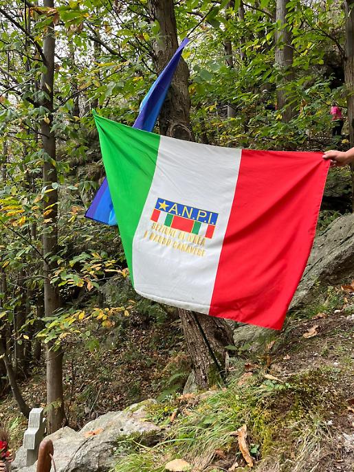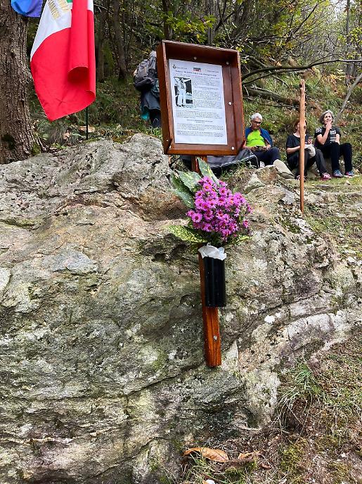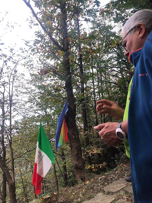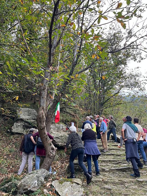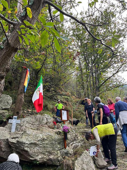Dopo i saluti, il gruppo si è avviato in corteo lungo la mulattiera che sale verso Scalveis, fino alla croce del partigiano Ulisse, il primo a cadere durante la battaglia. Il sentiero è lo stesso di allora: stretto, umido, coperto di foglie. In silenzio, passo dopo passo, i partecipanti hanno portato fiori e parole.