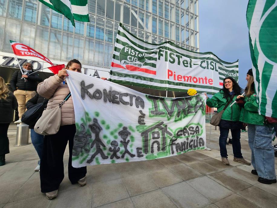 Dal presidio è arrivata una richiesta chiara e netta: la Regione Piemonte deve intervenire direttamente, convocare l’azienda e aprire un confronto vero. Non solo sulla vertenza Konecta, ma anche su questioni più ampie e strutturali che riguardano l’intero settore delle telecomunicazioni: gare d’appalto, applicazione corretta dei contratti nazionali, politiche industriali, qualità del lavoro. Perché la chiusura delle sedi di Ivrea e Asti viene letta dai sindacati e dagli amministratori locali come un segnale di disimpegno dal territorio piemontese, con ricadute sociali e occupazionali destinate a colpire aree già segnate da fragilità industriali.