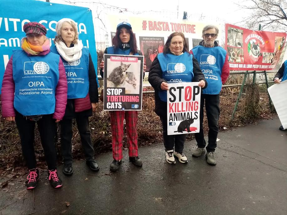 I volontari dell’OIPA di Milano, insieme alla sezione OIPA di Novi Ligure e agli attivisti di Feline Guardians Italia, si sono riuniti in un presidio carico di dolore, indignazione e determinazione. Un sit-in nato per denunciare pubblicamente una realtà che continua a essere ignorata: le crudeltà inflitte agli animali in Cina e diffuse online come fossero spettacolo.