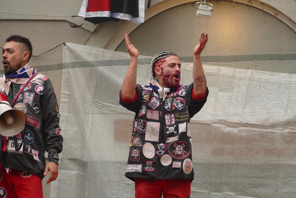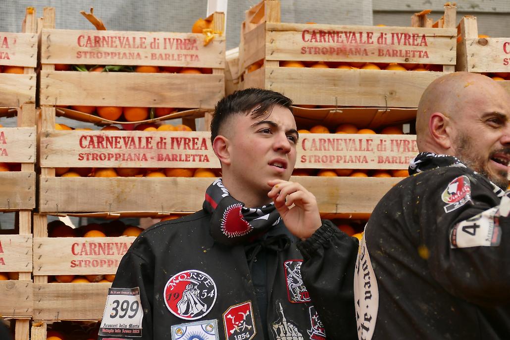 — A differenza degli aranceri a piedi gli aranceri sui carri indossano una divisa composta di una maschera di cuoio (con grate o plexiglass davanti agli occhi) e di un’imbottitura sul busto. Ogni Carro da getto, indipendentemente dal fatto che sia una pariglia o un tiro a quattro, prevede la presenza di un Cavallante e del Capocarro, colui che cura l’organizzazione e la gestione del carro e degli aranceri.