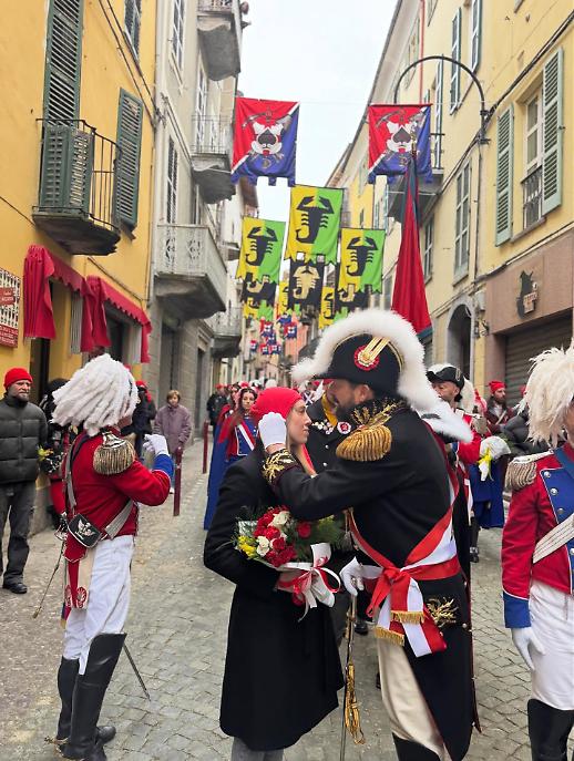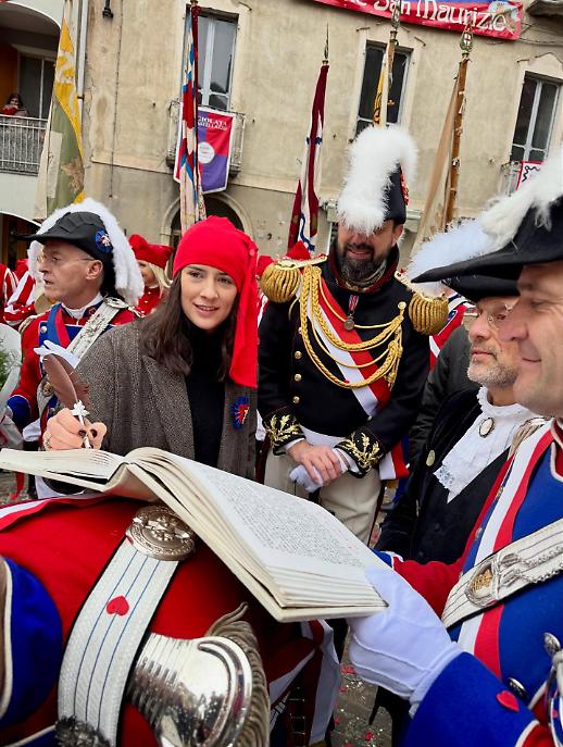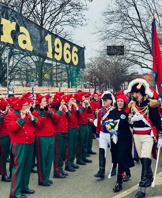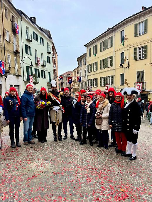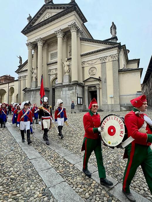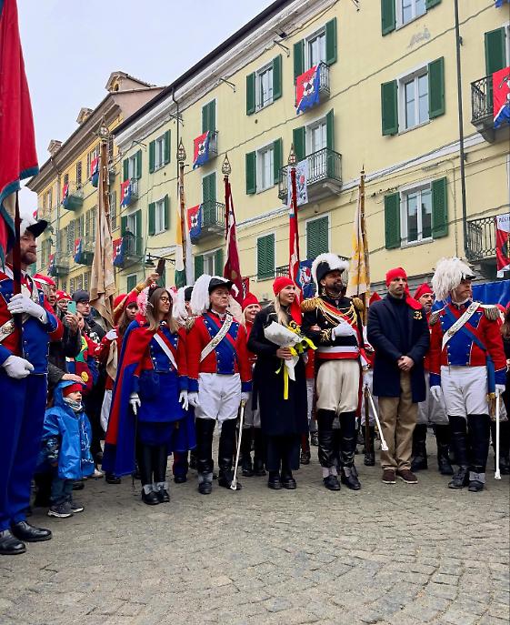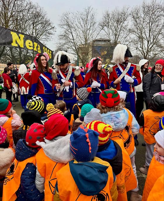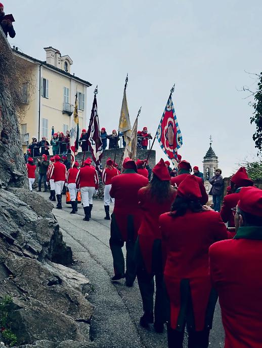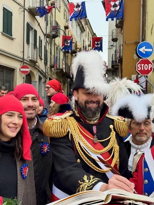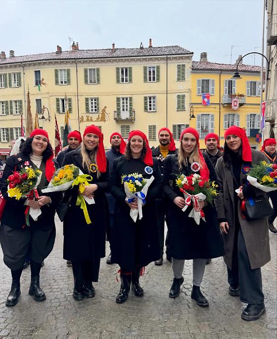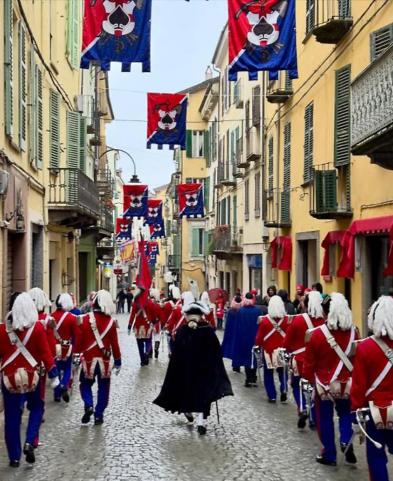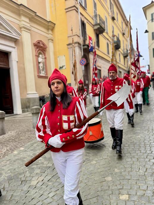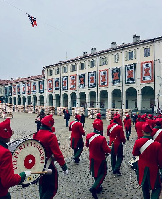 I cortei si sono mossi dalla Parrocchia di San Maurizio per poi toccare, a cadenza di mezz’ora, Sant’Ulderico, San Lorenzo, San Salvatore e infine San Grato. Le vie del centro si sono riempite del passo cadenzato dei partecipanti, del suono degli ottoni, dei saluti dalle finestre, dei bambini con il berretto frigio in testa. Non un semplice passaggio formale, ma una vera e propria processione laica che intreccia fede popolare e tradizione civica, in un equilibrio che solo Ivrea riesce a custodire con questa intensità.