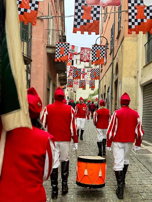 Alle 09.30, puntuale come da cerimoniale, si è aperta la mattinata con le Zappate degli Scarli. Il Generale del Carnevale, in alta uniforme, ha accompagnato le coppie di sposi designate nelle parrocchie cittadine dove, secondo l’antico rito, sono stati innalzati gli Scarli: pali intrecciati di erica che simboleggiano protezione, fertilità e rinascita. Un gesto semplice, quello della zappata, ma denso di significato, perché segna simbolicamente l’avvio di un percorso che culminerà con l’accensione dei falò, quando la città saluterà l’inverno per aprirsi alla primavera.