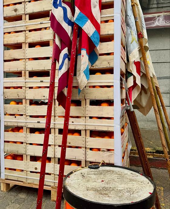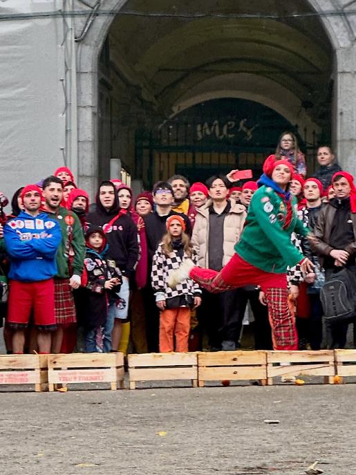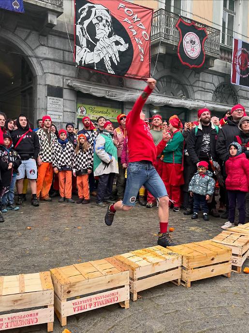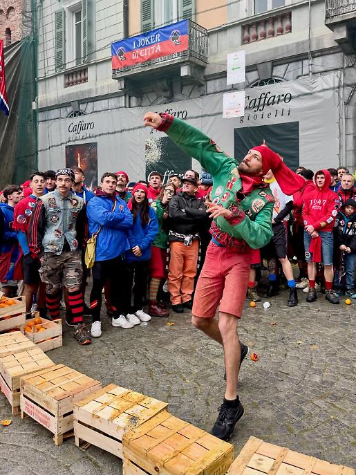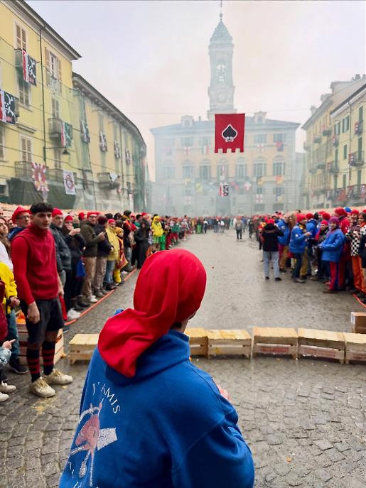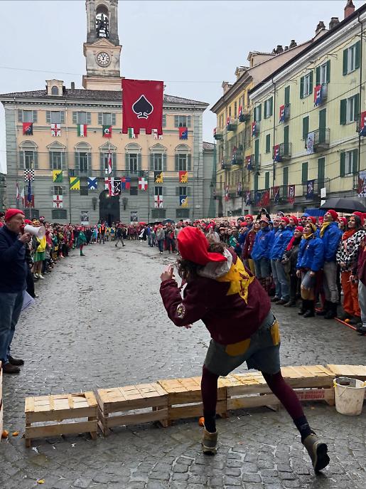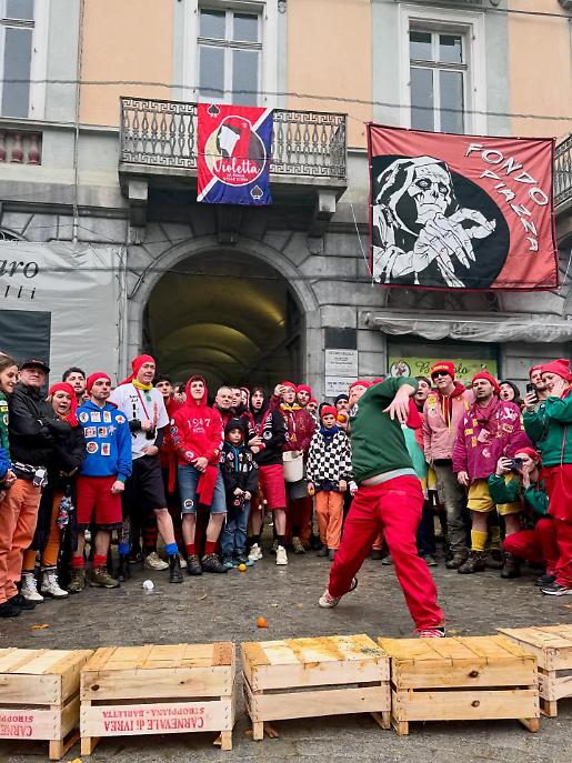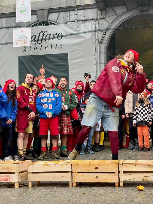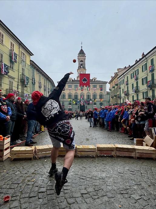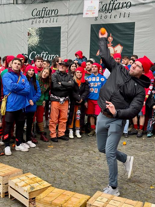 Subito dopo, alle 13.00, la piazza ha cambiato volto. Al raccoglimento simbolico è subentrata l’energia della competizione con il Trofeo Pich e Pala, sfida di tiro lungo dell’arancia. Decine di partecipanti si sono alternati nel tentativo di lanciarla il più lontano possibile, tra applausi, incitamenti e sorrisi. Un momento ludico, certo, ma anche un passaggio che anticipa lo spirito combattivo della Battaglia delle arance.