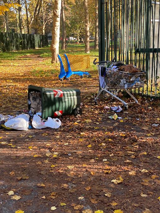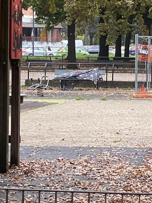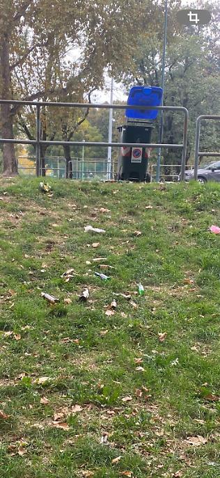 Le foto che arrivano dal quartiere parlano da sole. Sotto il cartello “dossi artificiali” giacciono vestiti buttati sull’asfalto, mentre i cassonetti traboccano di spazzatura e i marciapiedi sono disseminati di sacchi neri aperti, bottiglie, resti di cibo, indumenti. Poco più in là, nel prato che un tempo era un’area giochi, due carrelli della spesa abbandonati si arrugginiscono accanto agli alberi, come monumenti all’incuria. Dietro le recinzioni, lenzuola stese a coprire le finestre trasformano le ex piscine in un accampamento improvvisato. E sulle panchine del parco, gruppi di persone si incontrano, bevono, si scambiano qualcosa, si accendono sigarette: uno spettacolo ormai quotidiano.