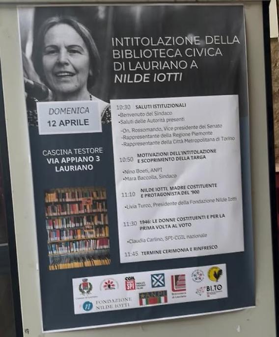 Domenica 12 aprile, a Lauriano, la biblioteca civica è stata intitolata a Nilde Iotti nel corso di una cerimonia molto partecipata alla Cascina Testore in via Appiano. La sala gremita e le persone rimaste anche all’esterno per seguire gli interventi hanno raccontato una comunità presente e coinvolta.