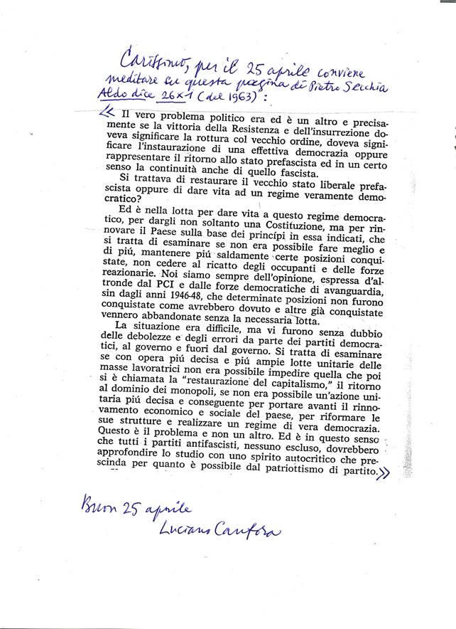 Diceva, Secchia: «Il vero problema politico era ed è… se la vittoria della Resistenza e dell’insurrezione doveva significare la rottura del vecchio ordine… l’instaurazione di una effettiva democrazia oppure rappresentare il ritorno allo stato prefascista ed in un certo senso la continuità anche di quello fascista…» E’ in parte quel che avvenne, e prendendo a prestito un giudizio coniato quasi trent’anni prima per la grande guerra, si può dire forse che quella della Resistenza fu una “vittoria mutilata”? «Si trattava di restaurare il vecchio stato liberale prefascista oppure di dare vita ad un regime veramente democratico?» Sappiamo che la realtà oscillò sempre fra i valori nuovi della Costituzione e la riluttanza, se non opposizione degli apparati statali e delle forze politiche più retrive. «Non era possibile fare meglio e di più…- si chiede Secchia - … mantenere più saldamente certe posizioni conquistate, non cedere al ricatto degli occupanti e delle forze reazionarie?... Certe posizioni non furono conquistate come avrebbero dovuto, altre abbandonate senza la necessaria lotta.» In quella situazione emersero “debolezze ed errori “ e si giunse in breve alla “restaurazione del capitalismo senza realizzare la “vera democrazia”. «Questo è il problema, e non altro.» Ce lo siamo trascinato sino ad oggi, partendo dall’ “amnistia” del 1946 dell’allora ministro della giustizia Togliatti, passando poi attraverso le pagine più buie della Repubblica, con i tentati colpi di stato, gli apparati deviati, il terrorismo di destra e di sinistra talvolta intrecciati e mai chiariti. Lo riscontriamo nelle parole e negli sguardi di tanti Partigiani, delusi dal mondo qual è, non come lo speravano combattendo. Oggi il significato più sostanziale di “destra” e “sinistra” rischia di perdersi, a tutto vantaggio delle forze più reazionare, sovraniste, neofasciste. Dandoci libertà e democrazia, i Partigiani hanno per definizione concesso una libertà di pensiero, parola, azione anche a chi continuò ad essere fascista. E’ la caratteristica precipua della democrazia, della quale purtroppo approfittano maggiormente le destre. «Tutti i partiti antifascisti, nessuno escluso, dovrebbero approfondire lo studio con uno spirito autocritico che prescinda per quanto è possibile dal patriottismo di partito.» raccomandava Secchia. Con una sola pagina, e la sua nota a margine, il professor Canfora ci ha suggerito l’argomento per un dibattito che, prendendo spunto dalla Festa di Liberazione, potrebbe continuare nei mesi prossimi. Magari con un nuovo Direttivo allargato nella Sede dell’Anpi, con partiti, associazioni, movimenti, cittadini… Grazie professor Canfora, buon 25 Aprile a Lei! La pagina del libro inviata dal professor Canfora, con le note di suo pugno