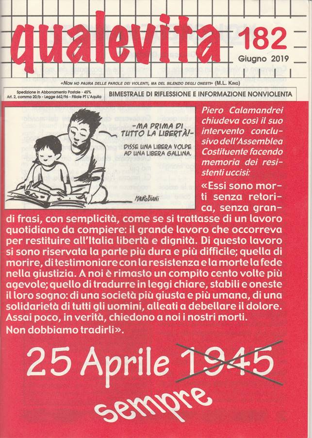 Caro Mario, Innanzitutto, un saluto cordiale e il mio GRAZIE per il vostro impegno e il lavoro costante, anche in questo periodo così duro. Desidero dare un piccolo contributo di idee per QUESTO 25 APRILE. Ritengo doveroso il ricordo dei partigiani morti nel corso dell'anno e suggerisco, per Giovanni Novo, la testimonianza che aveva dato alle ragazze della Scuola Tecnica Statale "ARDUINO" di Ivrea nel 1961 in "La RESISTENZA IN ALCUNE TESTIMONIANZE " (INCHIESTA COLLETTIVA) a cura del CENTRO DOCUMENTAZIONE PACE 2011,pagg. 99-101). Mi piacerebbe che si desse attenzione ad alcune figure di partigiane, come Ada Gobetti Marchesini e Tina Anselmi: vi invio un articolo da "IL SOLE-24ORE DEL 2019 in proposito (E' solo un'indicazione...) Sempre bello e commovente ascoltare CANTI PARTIGIANI nell'esecuzione di diversi gruppi, primo fra tutti il CORO BAIOLESE, quest' anno che non si è potuta tenere la serata nel loro salone. Invio anche una pagina di CALAMANDREI, dal periodico "QUALE VITA".. Sono spunti, ma non sono riuscita a fare di più.